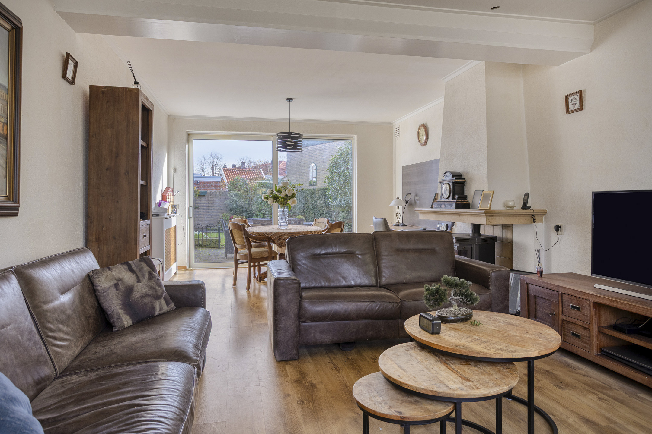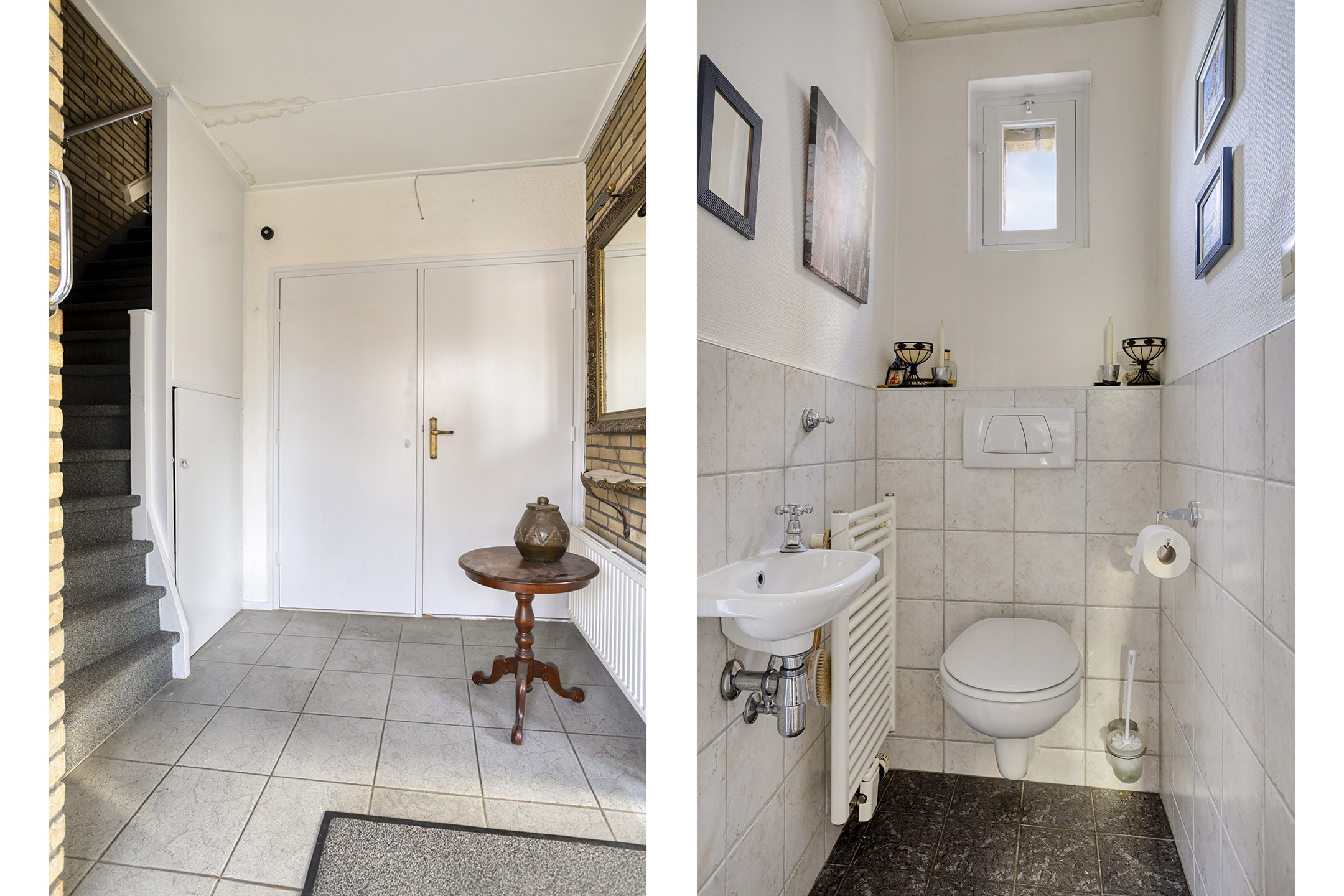 De entree bevindt zich aan de voorzijde van de woning en leidt naar de hal met de trapopgang naar de eerste verdieping, het toilet en de meterkast. Vanuit de hal bereik je de ruime en lichte woonkamer met zithoek en eetgedeelte. De woonkamer krijgt veel lichtinval dankzij de grote ramen en staat in directe verbinding met de keuken. Vanuit de keuken heb je toegang tot het terras en de achtertuin, waar je kunt genieten van een mooi aangelegd terras, een groen gazon en beplanting. De badkamer op de begane grond is eveneens vanuit de keuken te bereiken en is uitgerust met een inloopdouche, toilet, wastafel met meubel en de opstelling voor de wasmachine en droger.