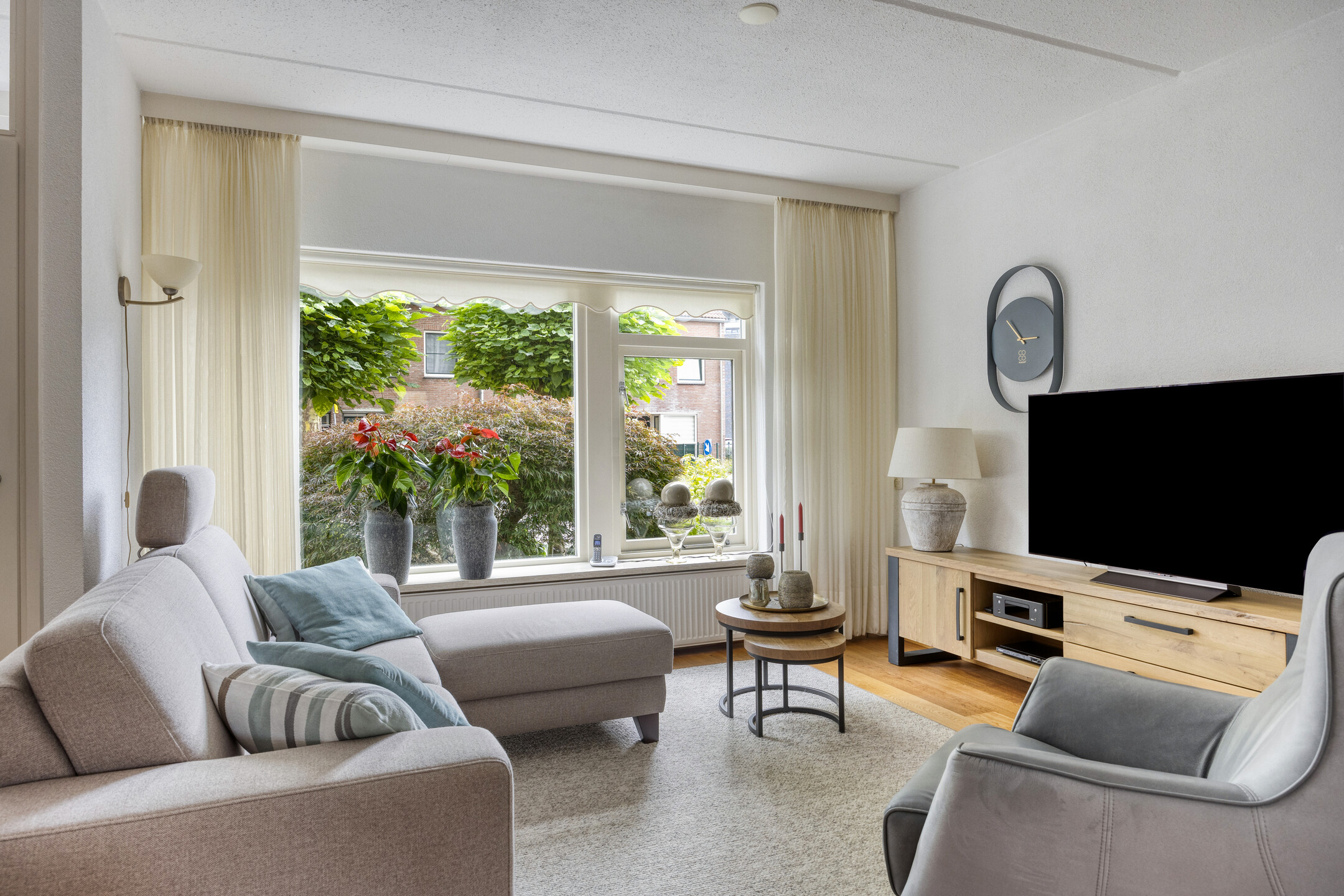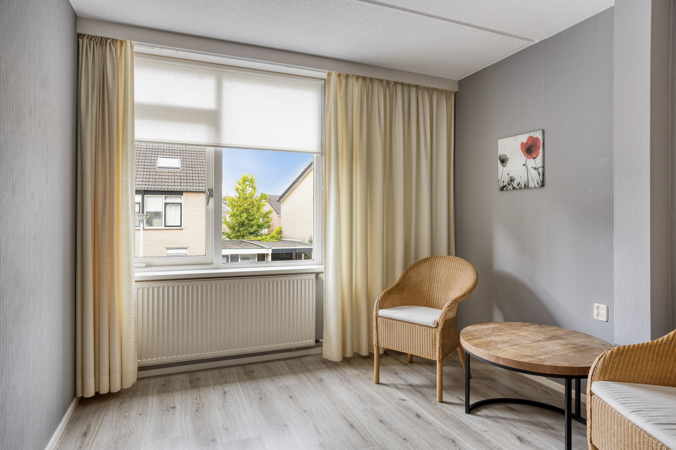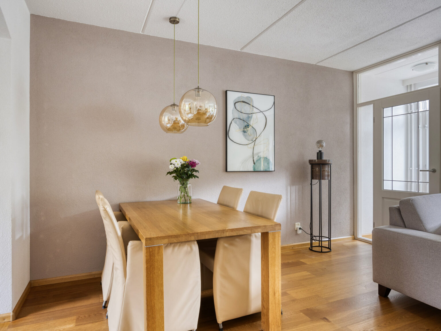 – De woonkamer is voorzien van een mooie eiken parketvloer.
