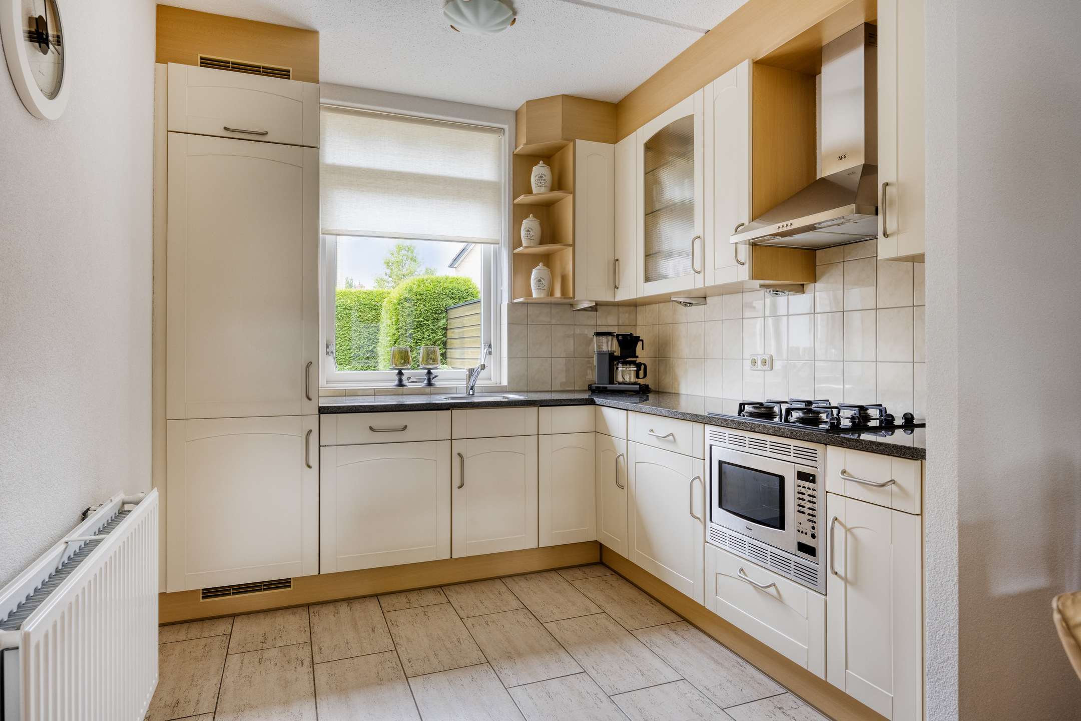 Entree, hal, straatgerichte woonkamer met provisiekast en een nette open keuken, voorzien van gaskookplaat, afzuigkap, combi-magnetron, vaatwasser, koelkast, vriezer en een granieten aanrechtblad. Aan de achterzijde bevindt zich een tweede hal met toiletruimte en trapopgang.