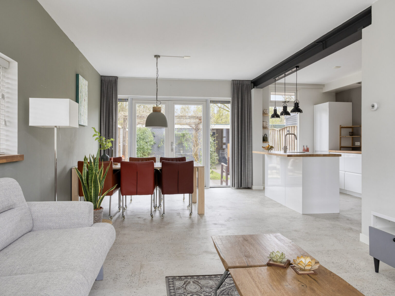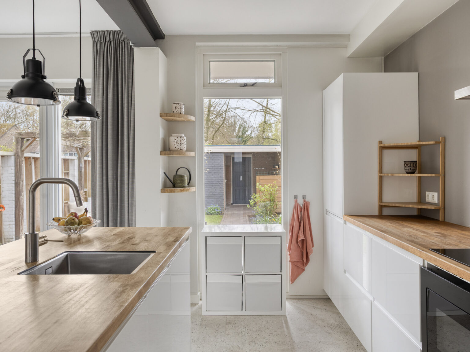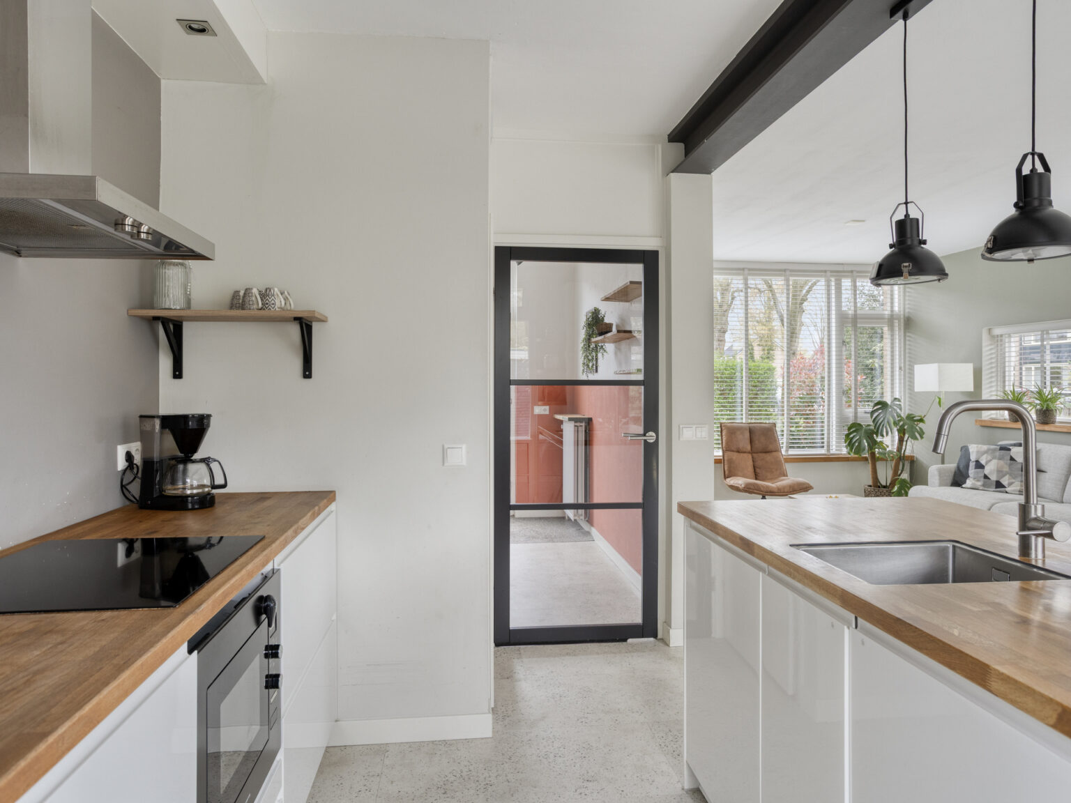Hal, toilet (wandcloset), provisiekast, ruime doorzonwoonkamer met veel extra licht en een fraai uitzicht door het zijraam, openslaande tuindeuren en een moderne keuken met een spoeleiland en voorzien van oven, inductiekookplaat, afzuigkap, koelkast, vriezer en vaatwasser.