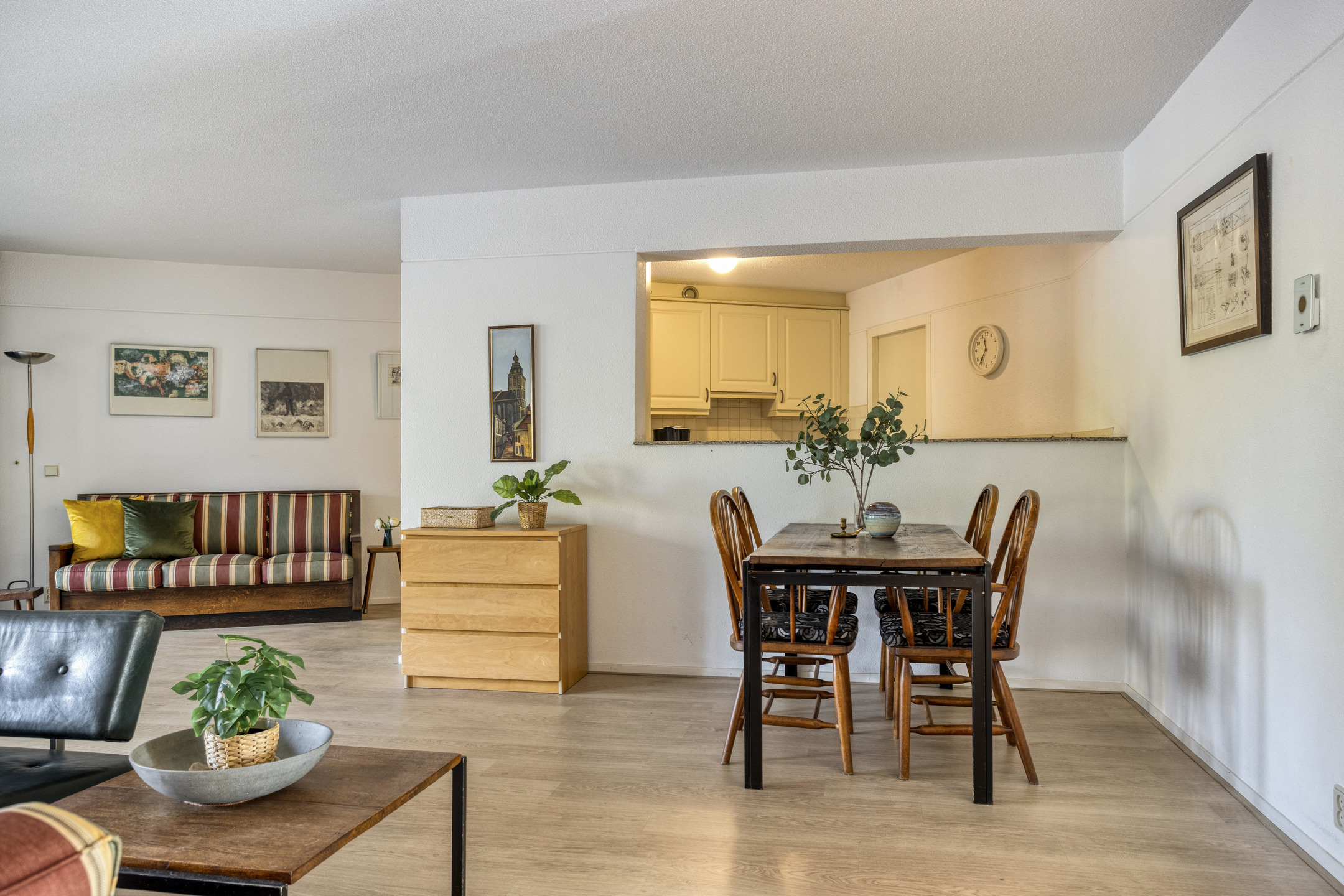 Ruime hal, royale woonkamer met een balkon aan de voorzijde van het complex voor de ochtendzon, en aan de zijde van het Van Heekpark een balkon waar u heerlijk van de avondzon en het uitzicht kunt genieten. De keurige keuken heeft een half open verbinding met de woonkamer en is voorzien van diverse inbouwapparatuur zoals een inductiekookplaat, afzuigkap, combimagnetron, koelkast, vaatwasser en een mooi granieten aanrechtblad. Aansluitend aan de keuken grenst een praktische bijkeuken.