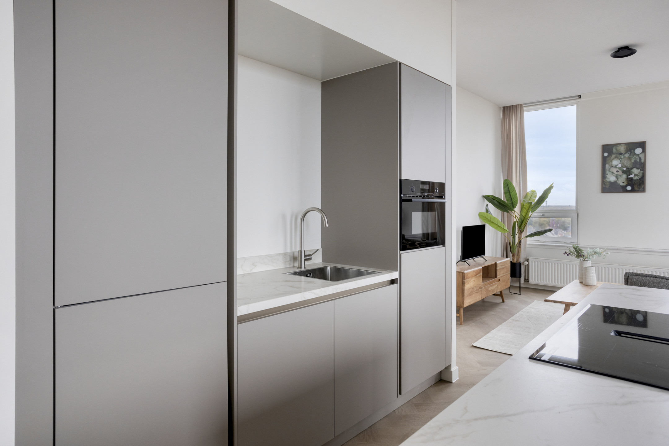 Entree/hal, toilet (luxe uitgevoerd), praktische berging met aansluiting voor de wasmachine, luxe nieuwe badkamer v.v. 2e toilet (wandcloset), inloopdouche en een badkamermeubel met dubbele wastafel, 2 ruime slaapkamers, royale woonkamer met zeer veel daglicht door de grote raampartijen en een fraai uitzicht over de zuidwest kant van de stad. De open keuken is ook nieuw en luxe uitgevoerd met o.a. een kookeiland, inductiekookplaat met downdraft (afzuigkap), vaatwasser, grote koelkast, combi-magnetron en een fraai aanrechtblad. Het gehele appartement is voorzien van een mooie visgraat pvc vloer en is voorzien van nieuw stucwerk.