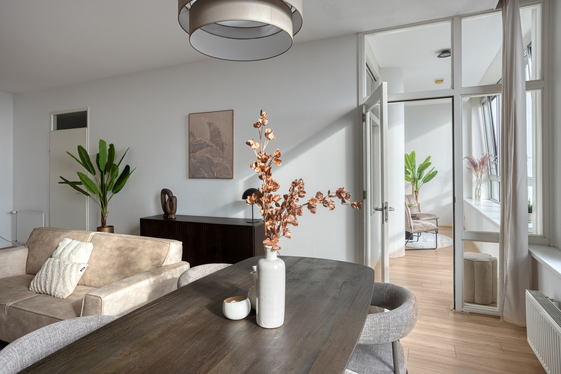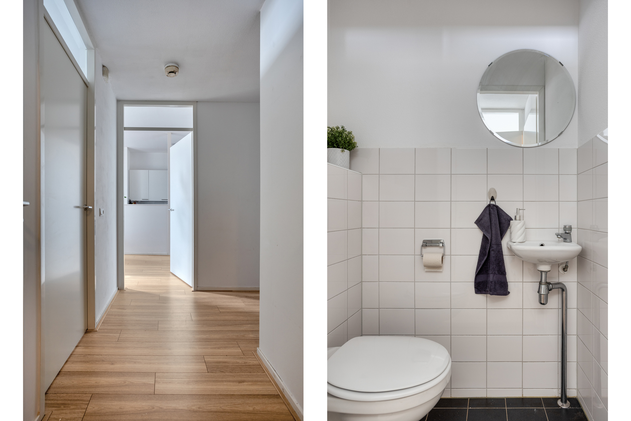 Entree/hal, toilet (wandcloset), nette badkamer v.v. 2e toilet (wandcloset), douche en een badkamermeubel met dubbele wastafel, 2 ruime slaapkamers (grenzend aan de loggia), moderne half open keuken met diverse inbouwapparatuur en aansluitend de praktische berging met aansluiting voor de wasmachine en een ruime woonkamer met veel daglicht door de grote ramen en vrij uitzicht over de oostzijde van de stad. Als verlengstuk van de woonkamer heb je direct toegang tot de loggia, een inpandige buitenruimte waar je het hele jaar door kunt genieten van een kop koffie en de ondergaande zon.