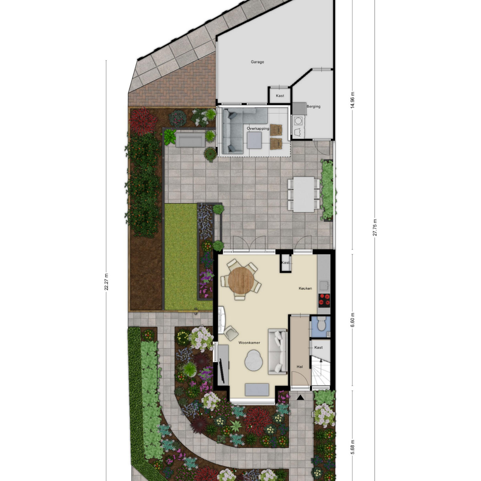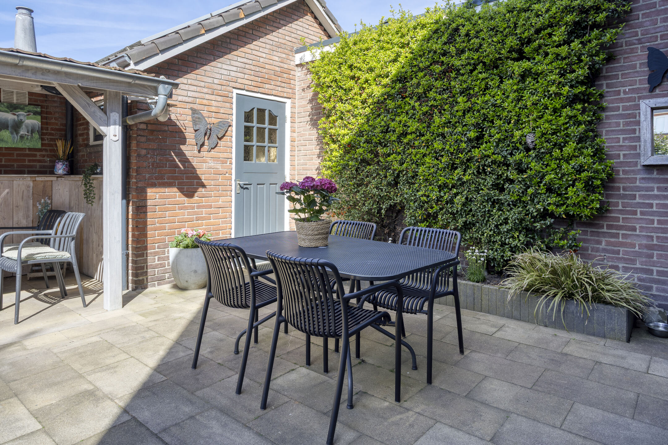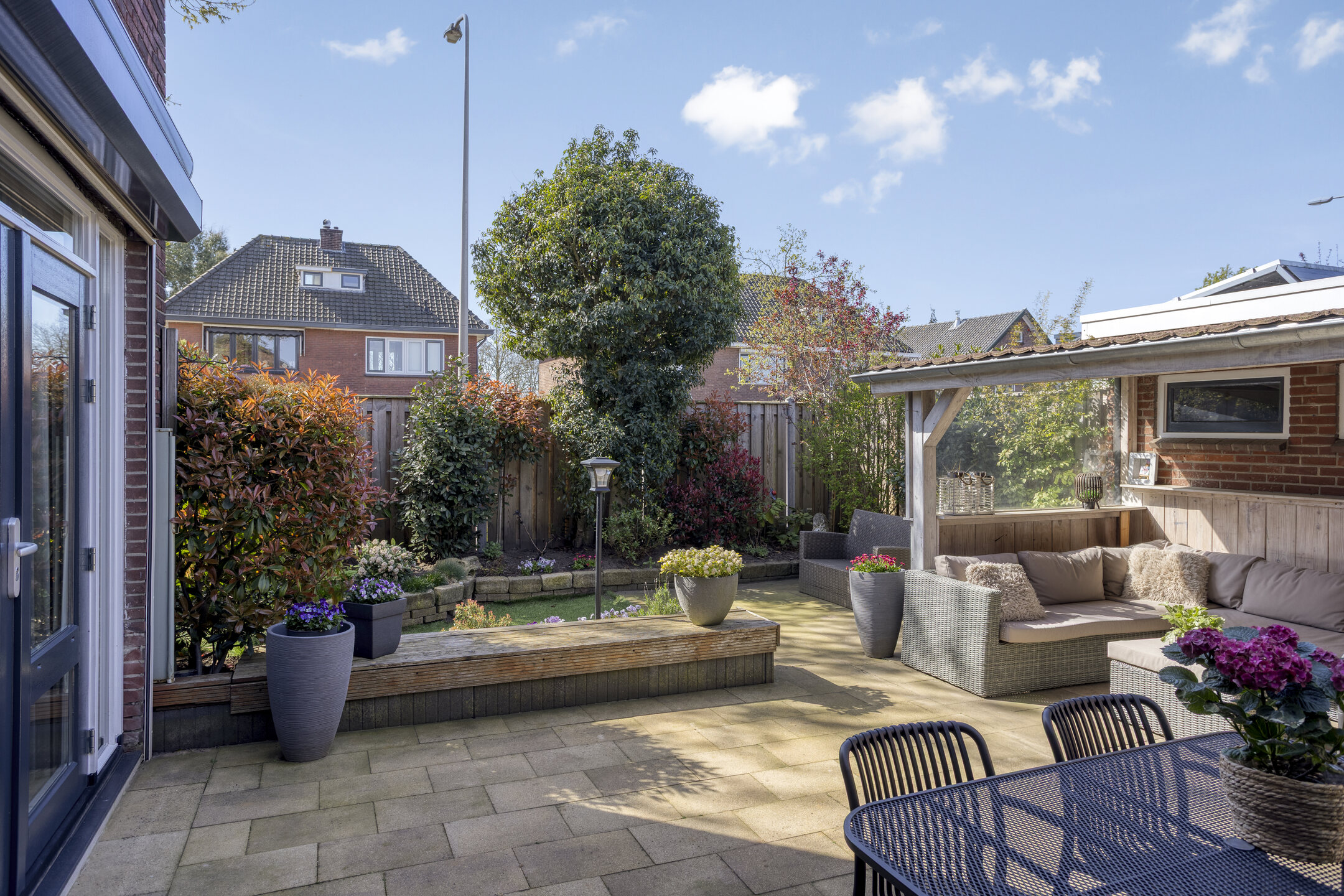 Via de keuken stap je de achtertuin in, die gunstig is gelegen op het westen. Hier kun je volop genieten van de middag- en avondzon. De tuin is verzorgd aangelegd met een combinatie van bestrating en groen en biedt meerdere zitplekken, waaronder een overkapping die tegen de garage is aangebouwd.