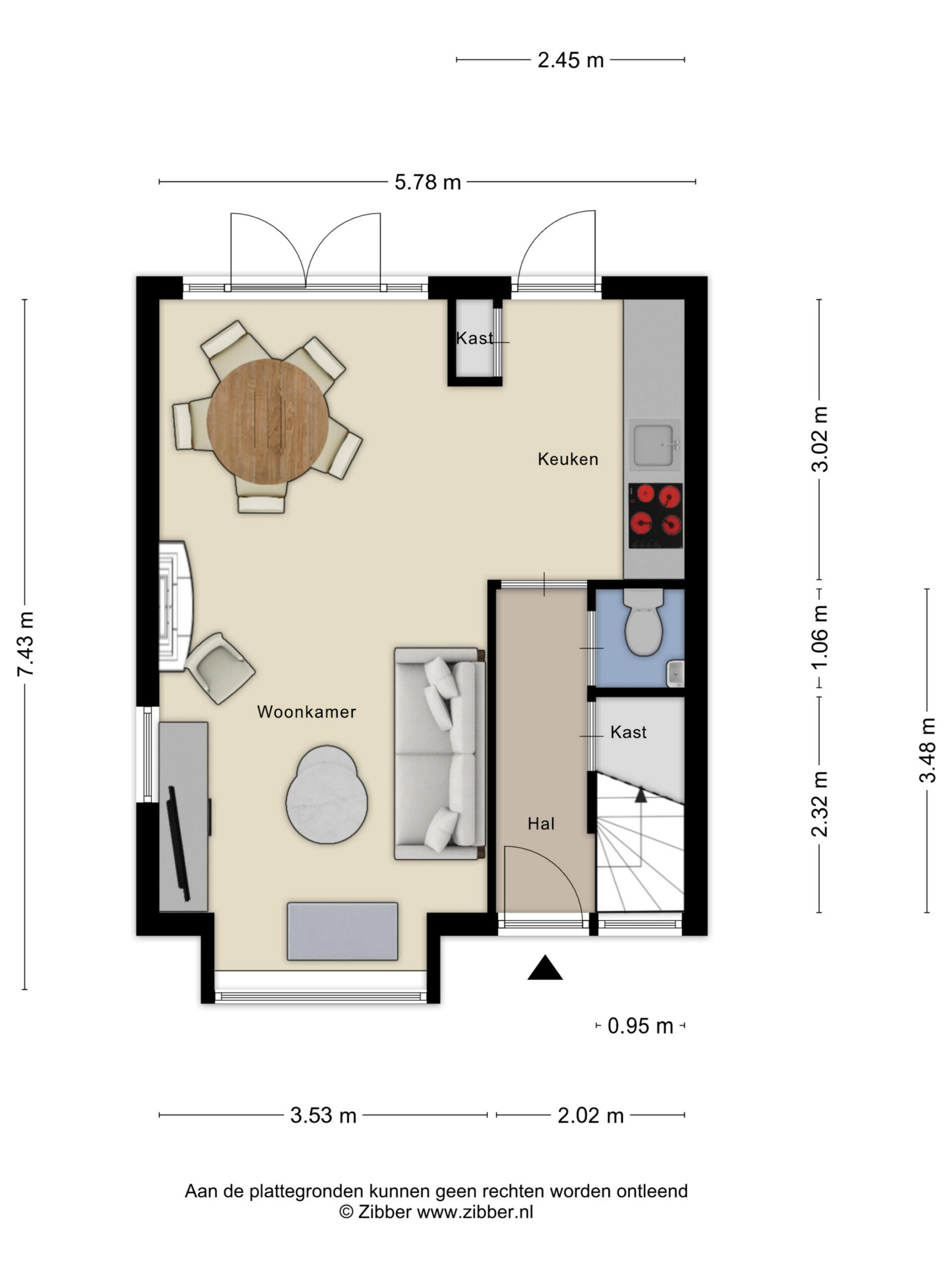 Je komt binnen in de hal, waar zich de meterkast, het toilet, kelderkast en de trapopgang naar boven bevinden. Vanuit hier loop je door naar de open keuken die zich aan de achterzijde van de woning bevindt. De open keuken is praktisch ingericht, met direct toegang tot de tuin. Vanuit de keuken loop je naar de lichte woonkamer, die dankzij de grote raampartijen een prettige en open sfeer heeft. Er is voldoende ruimte voor een comfortabele zithoek aan de voorzijde en een eethoek richting de tuin. Aan de zij- en achterzijde van de woning bevinden zich rolluiken op de begane grond en de eerste verdieping. Tot slot is er aan de achterzijde een praktisch zonnescherm aanwezig, ideaal voor zomerse dagen om zowel beneden als boven het binnen koel te houden.