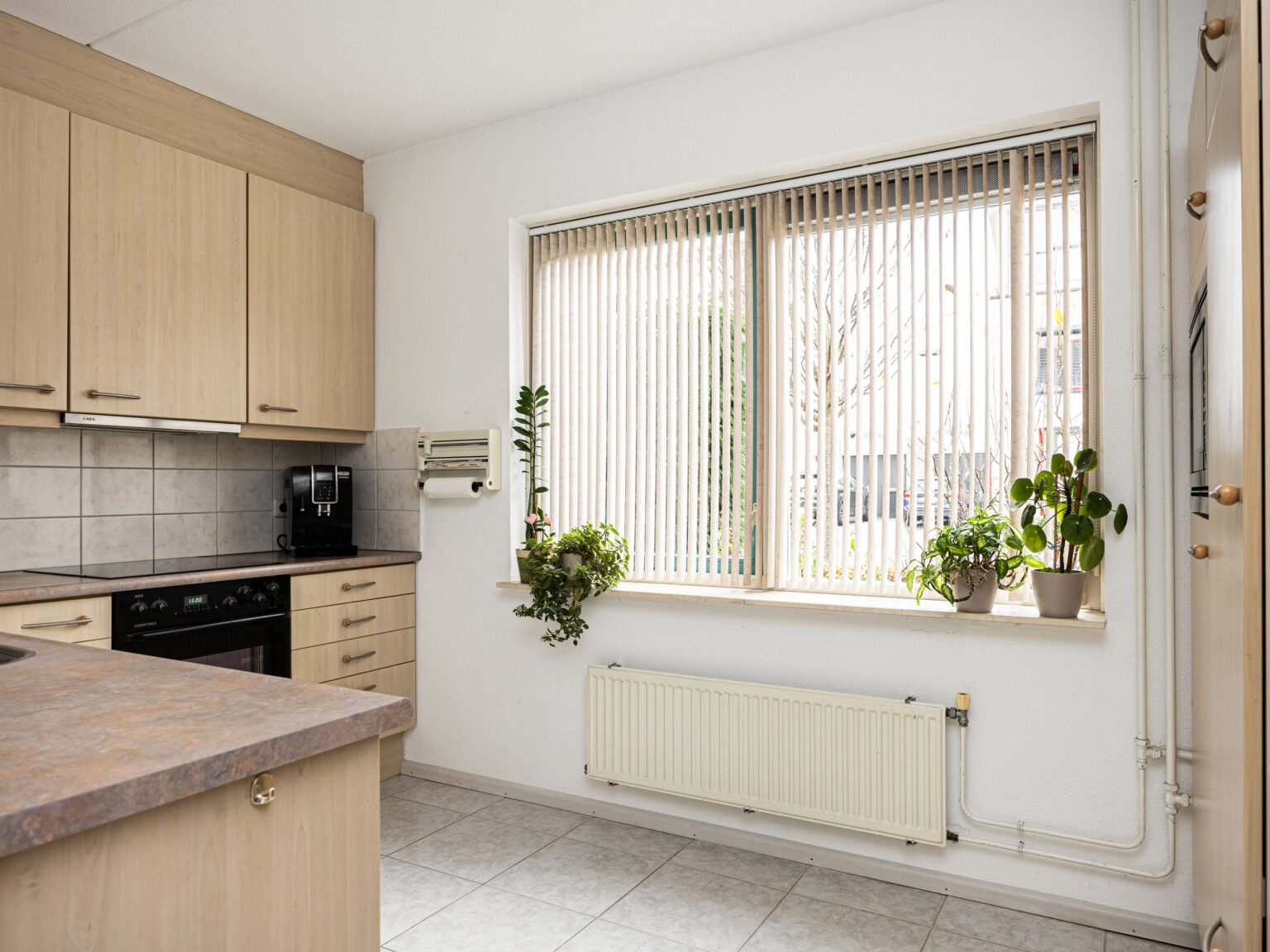 De indeling is praktisch: de open keuken bevindt zich aan de straatzijde, terwijl de woonkamer met eethoek uitkijkt op de achtertuin. Via de bijkeuken is de inpandige garage/berging bereikbaar.