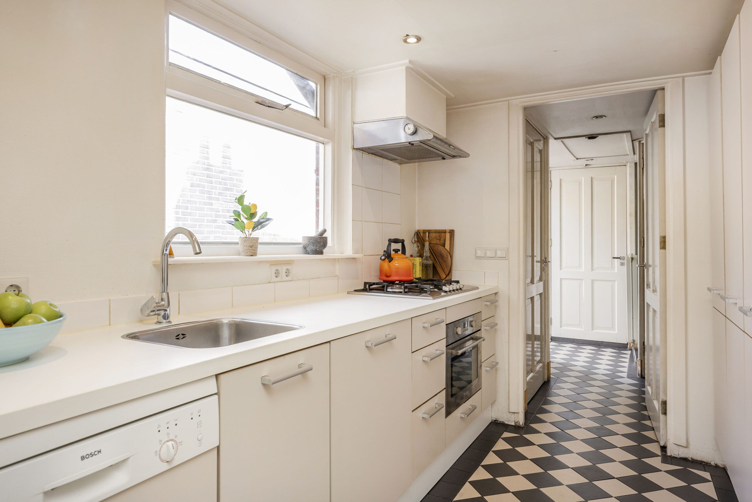 Lange hal met meterkast, kelder en trapopgang. Toegang tot de lichte woonkamer aan de voorzijde en eetkamer aan de achterzijde van de woning. De keuken is voorzien van de nodige inbouwapparatuur zoals een vaatwasser, 5-pits gaskookplaat met afzuigsysteem. Via de keuken toegang tot de bijkeuken met plek voor witgoed, apart toilet, badkamer met inloopdouche, dubbele wastafel en toegang tot de tuin.