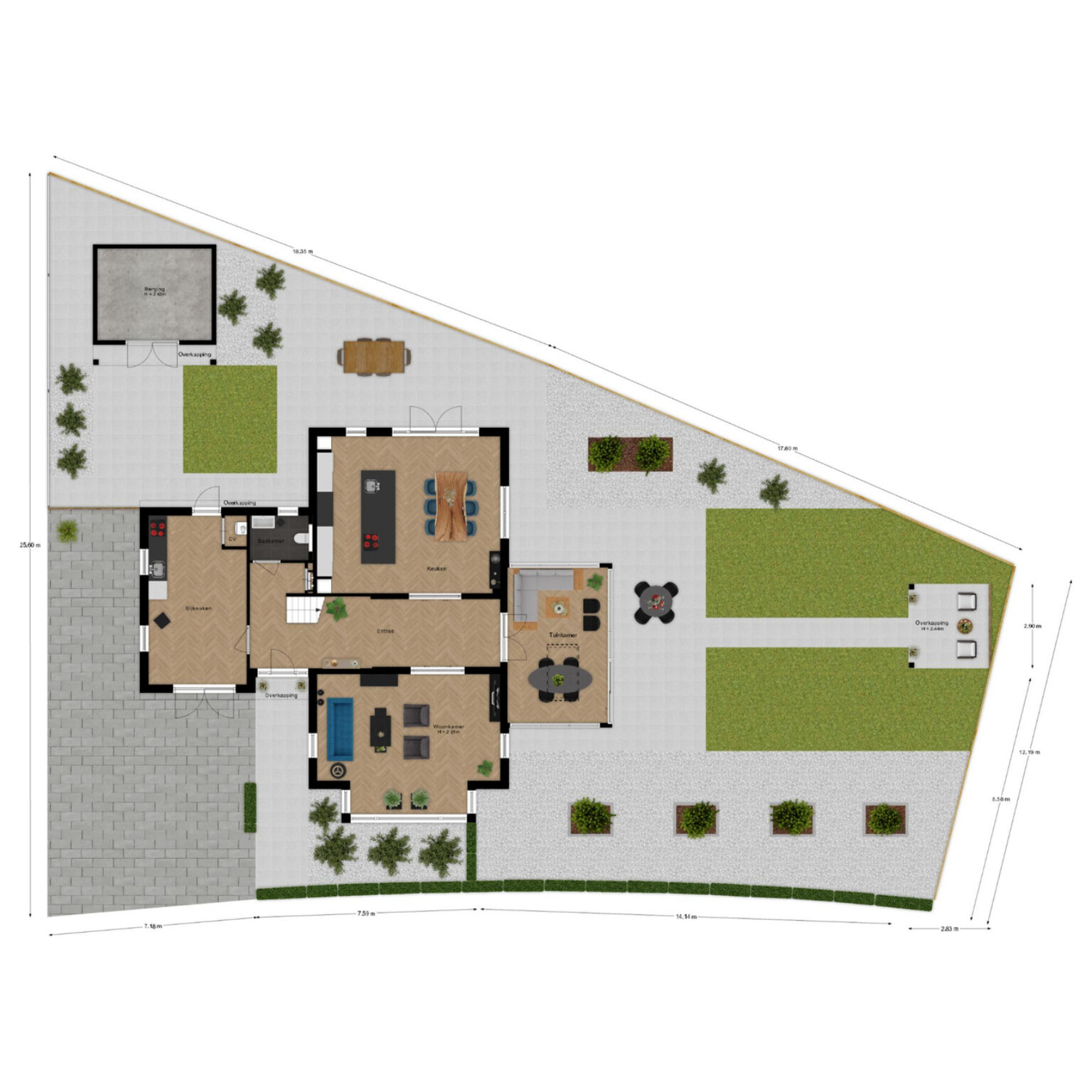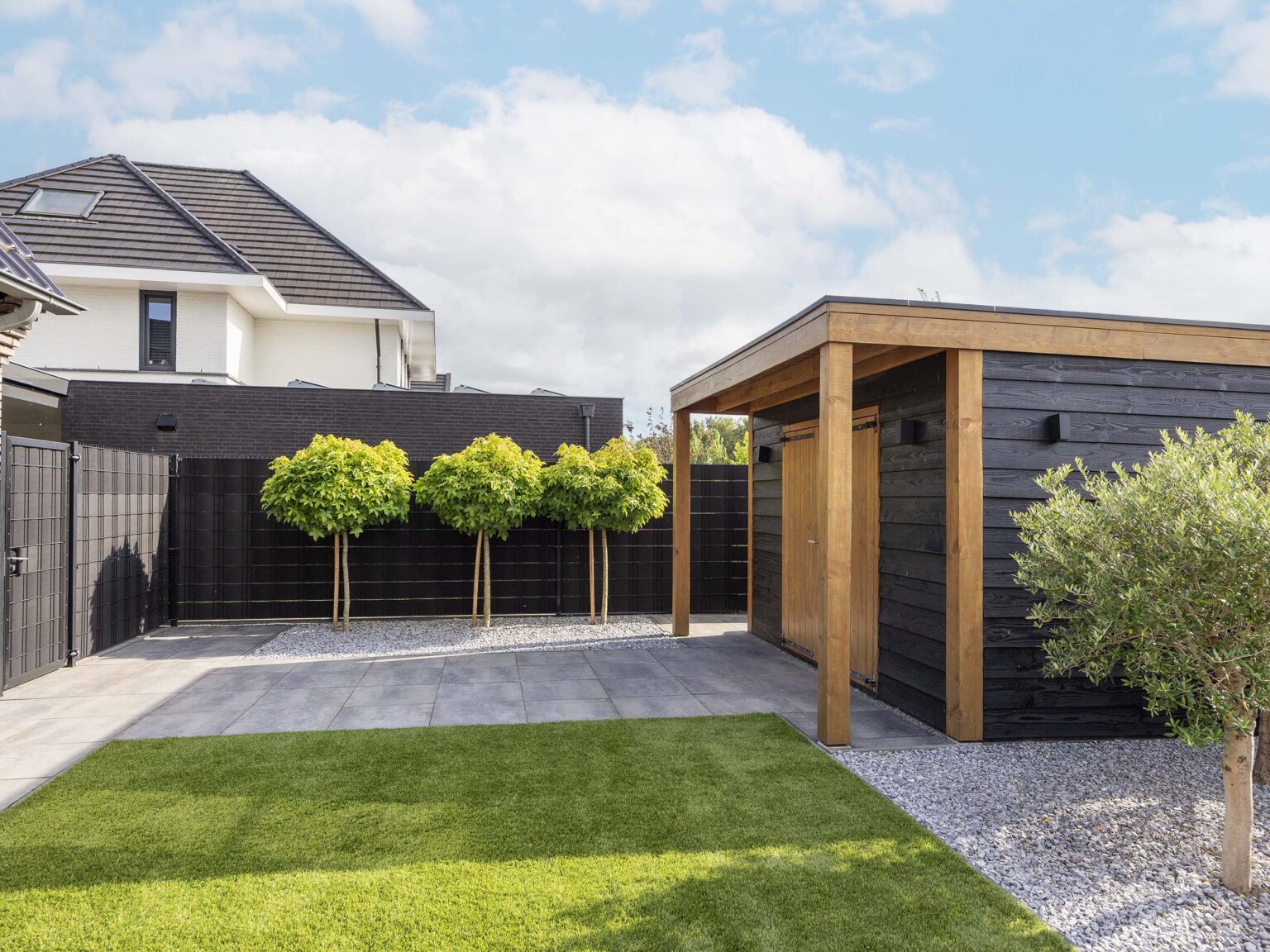 De tuin is rondom gesitueerd. Aan de voorzijde voldoende plaats voor het parkeren van meerdere auto’s op eigen terrein. Er is een doordacht ontwerp toegepast, dat aansluit op de lijnen binnen de woning, voorzien van bestrating, (kunst)gazon, beplanting en borders. De tuin wordt omringd door een verstevigd hekwerk en zorgt voor een en al privacy in de tuin. De praktische tuinberging biedt voldoende ruimte voor fietsen, gereedschappen en opslag, waardoor bijvoorbeeld de inpandige berging/bijkeuken netjes blijft en een verlengstuk vormt van de woning.