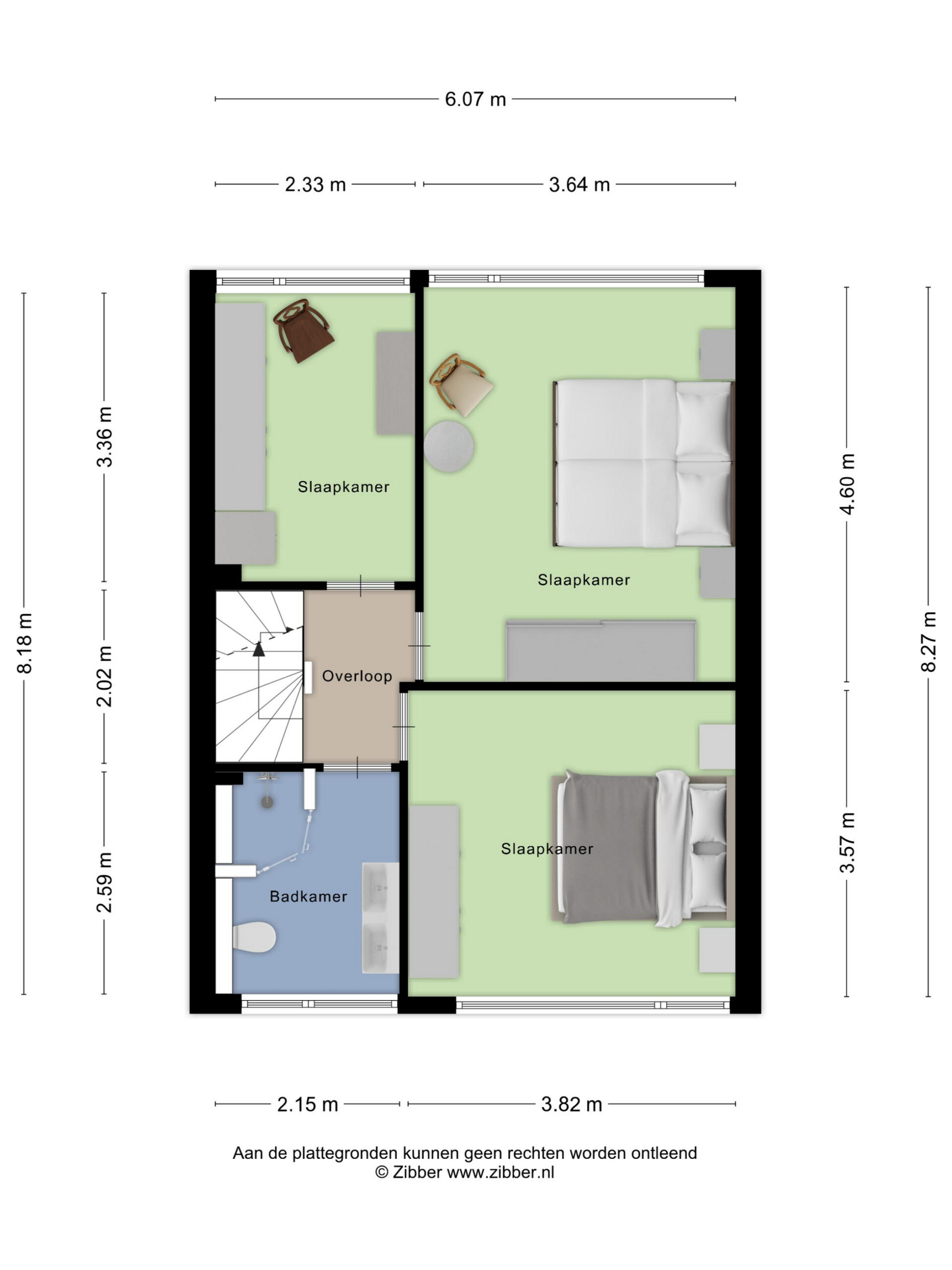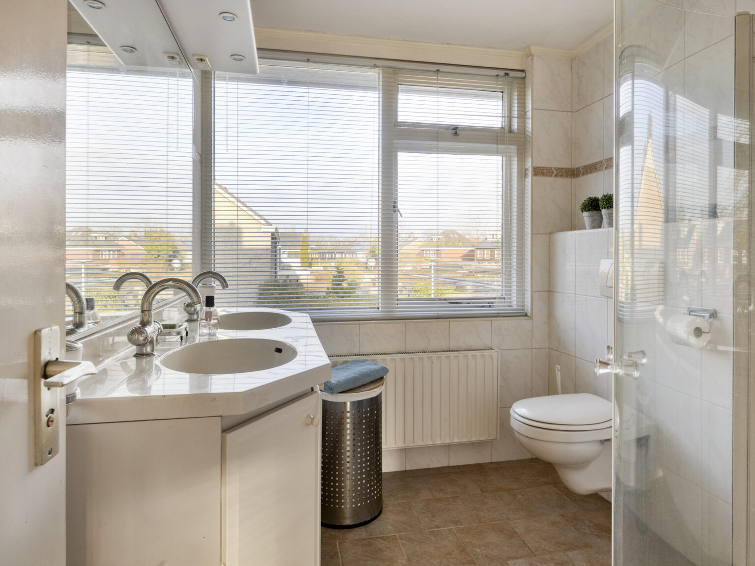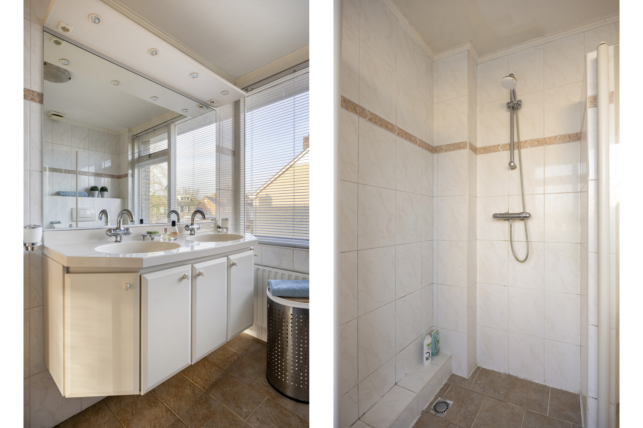 Overloop met toegang tot de drie slaapkamers, elk met grote raampartijen en met aantrekkelijke afmetingen van respectievelijk ca. 8 m2, 13,5 m2 en 17 m2. De badkamer is voorzien van een douche, dubbele wastafel met meubel en een hangend toilet.