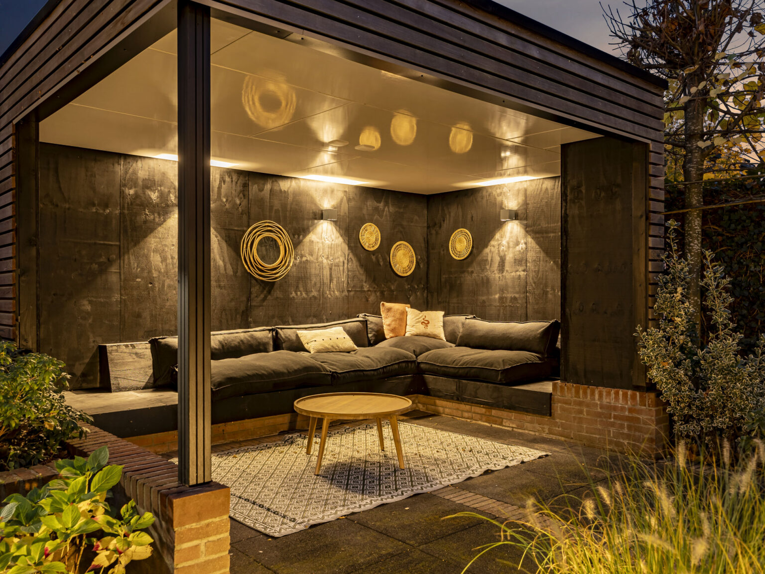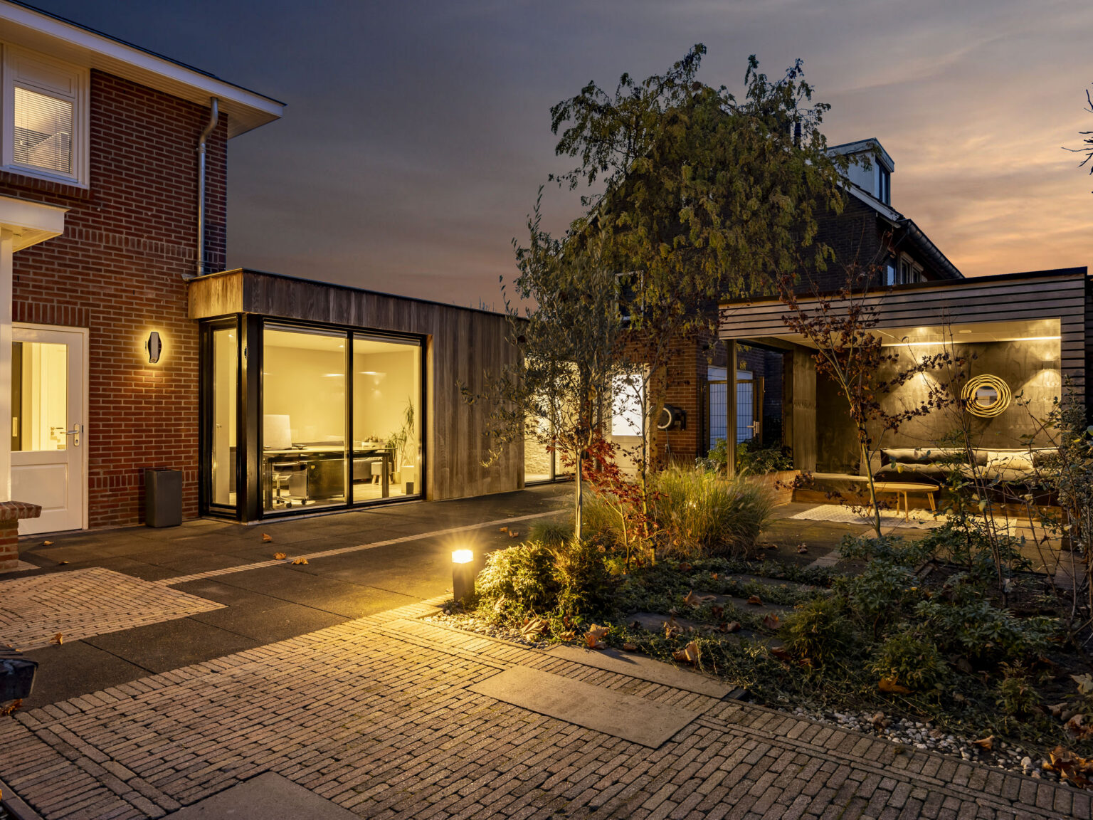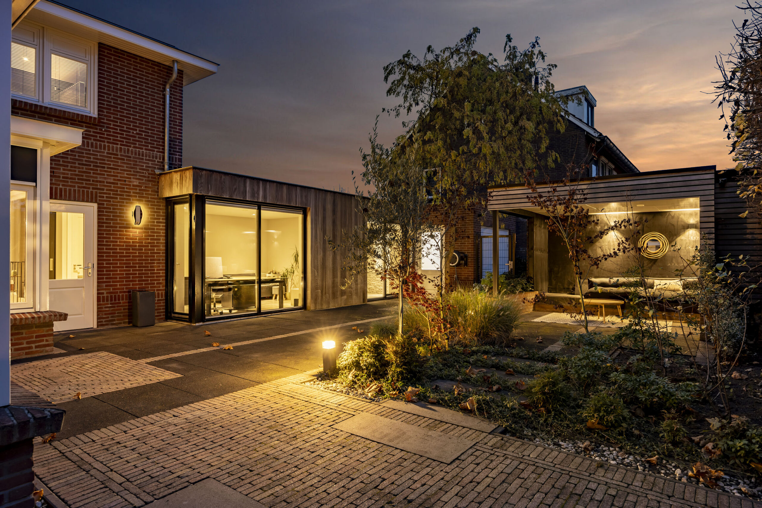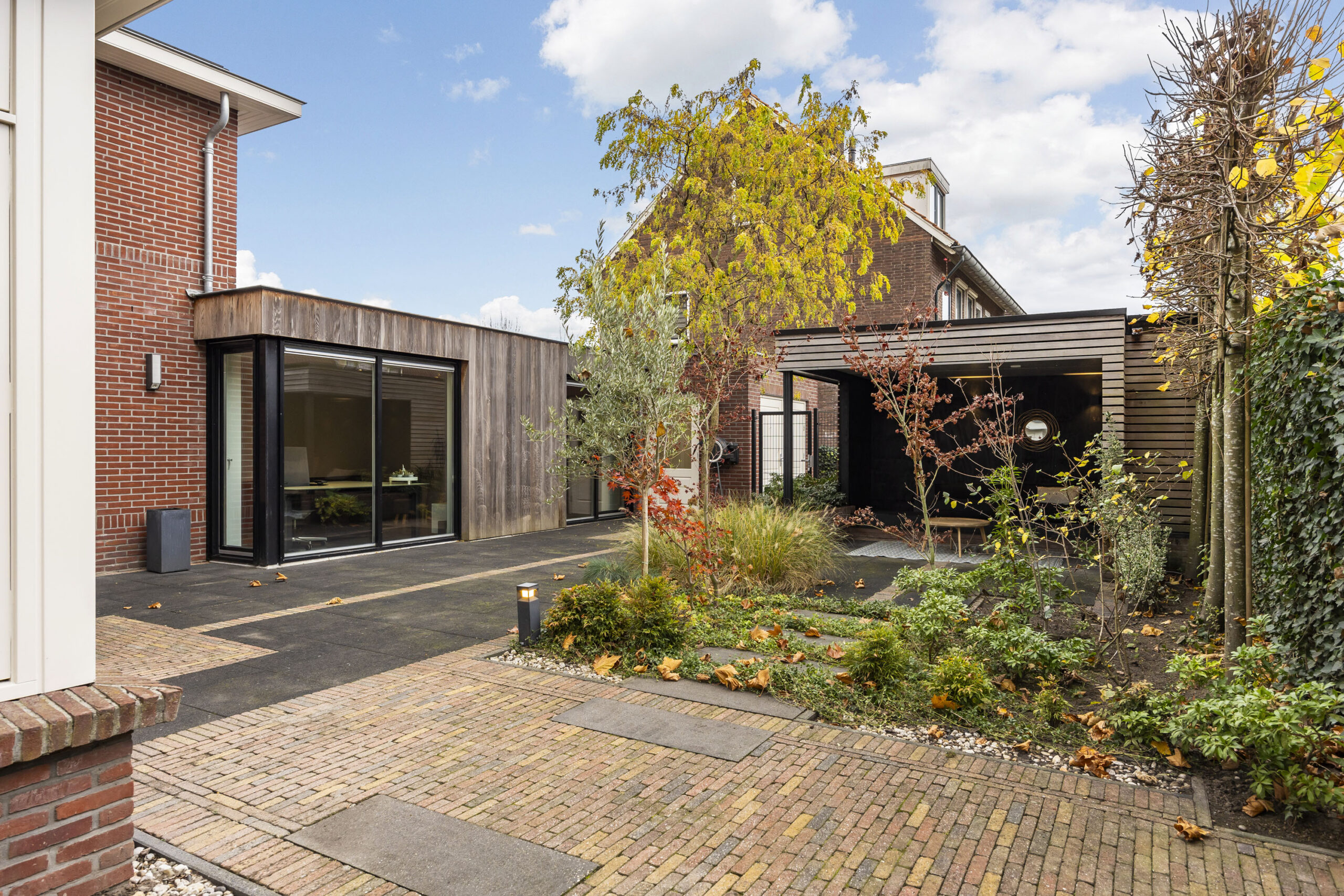 In de aanbouw van de woning bevindt zich een kantoorruimte, hal en een inpandige garage met toegang tot de achtergelegen parkeerplaats op eigen terrein. De achtertuin is verzorgd aangelegd en biedt een fijne combinatie van terrassen, bestrating en groenperken. Dankzij de praktische indeling is er voldoende ruimte voor meerdere zitplekken en geniet je zowel van gemak als van een stukje groen. De fraaie overkapping is voorzien van sfeerverlichting en biedt ruimte voor een eettafel of loungeset, een heerlijke plek om lange zomeravonden door te brengen of gezellig buiten te dineren.