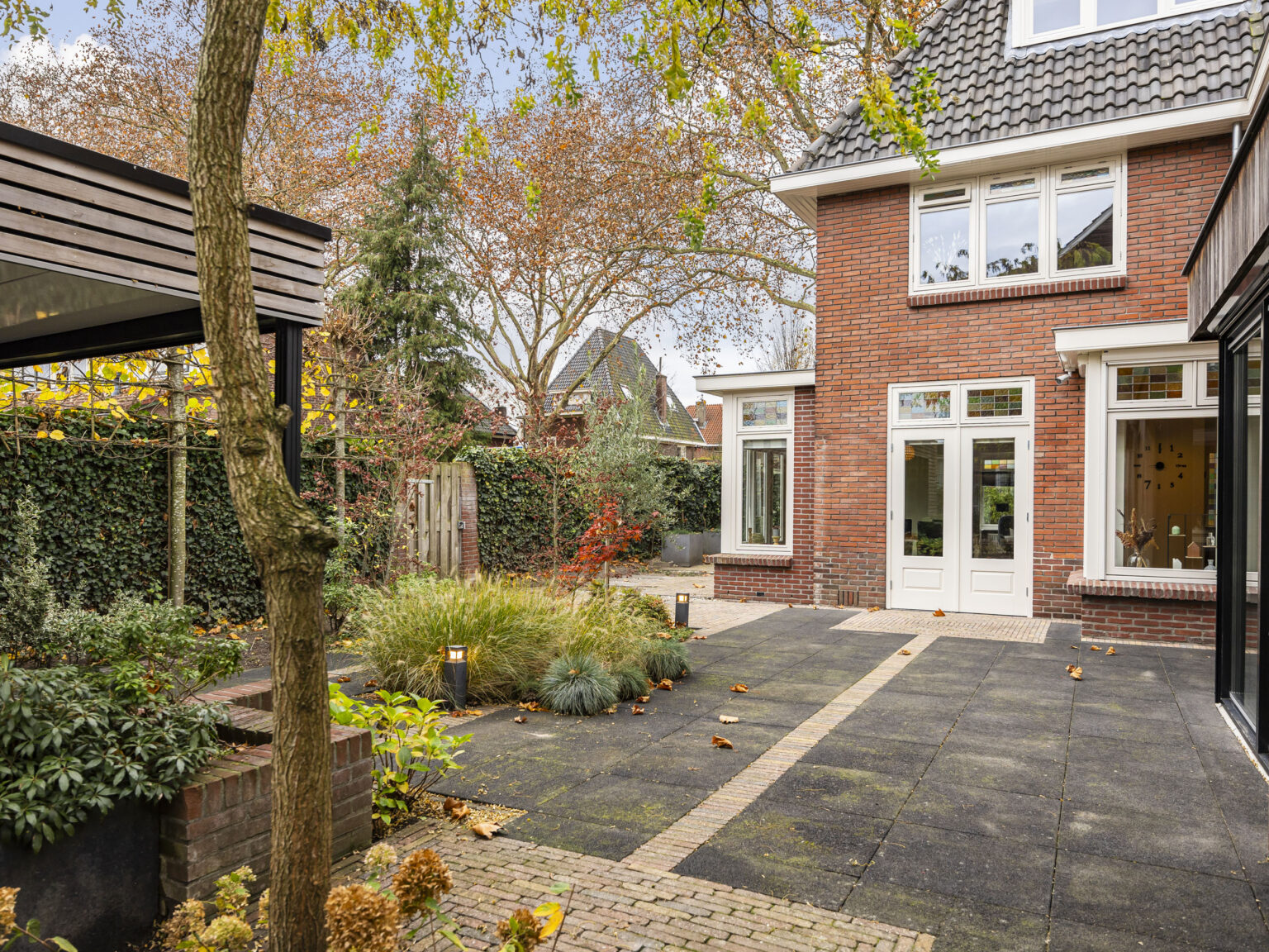 De zonnige achtertuin, die veel privacy biedt en rondom fraai is aangelegd, biedt meerdere zitplekken én een luxe overkapping waar je heerlijk kunt relaxen. Via de Abelenstraat bereik je de de oprit aan de achterzijde met directe toegang tot de berging/garage.