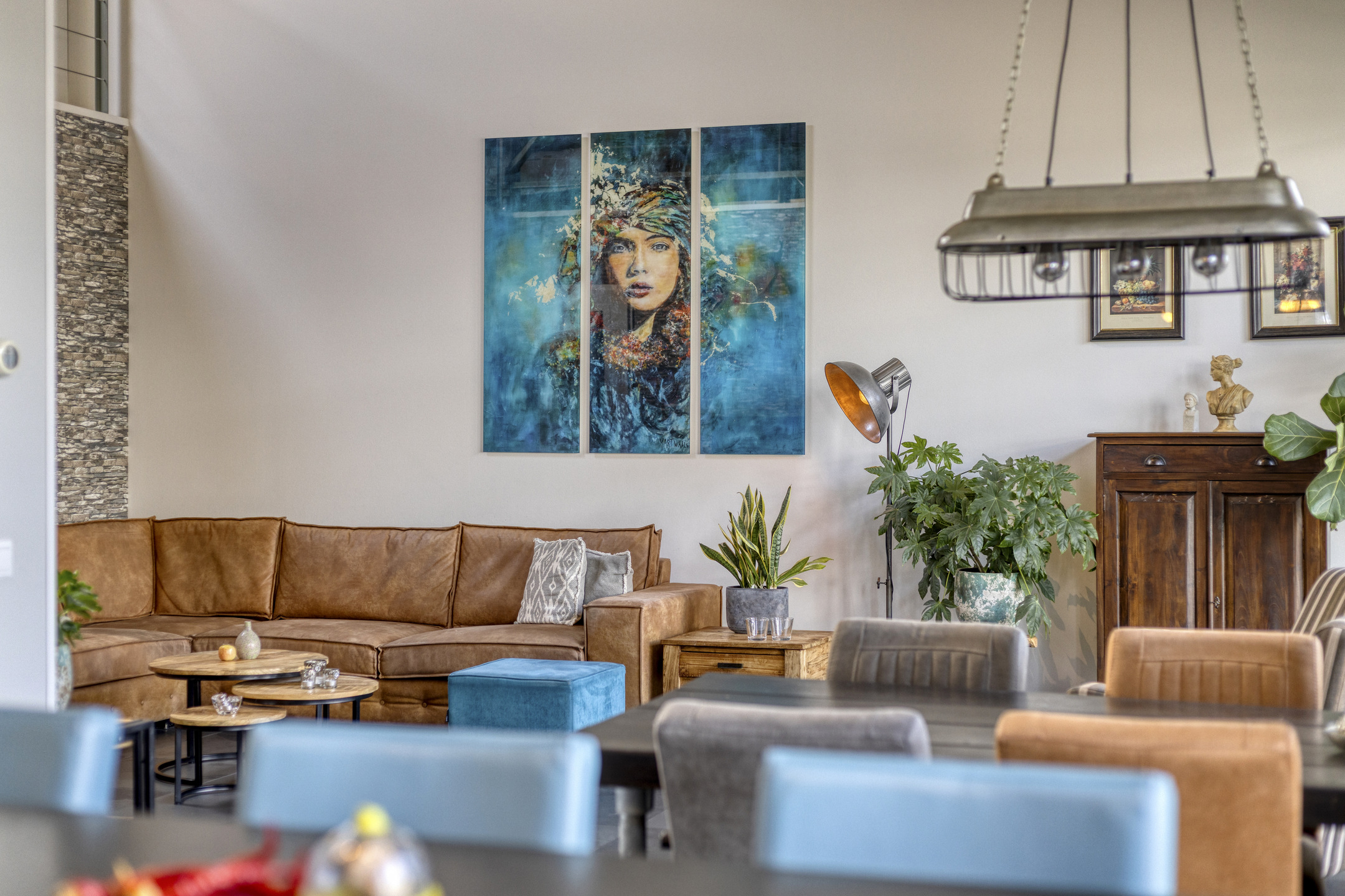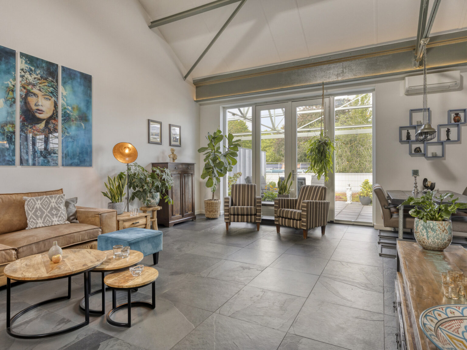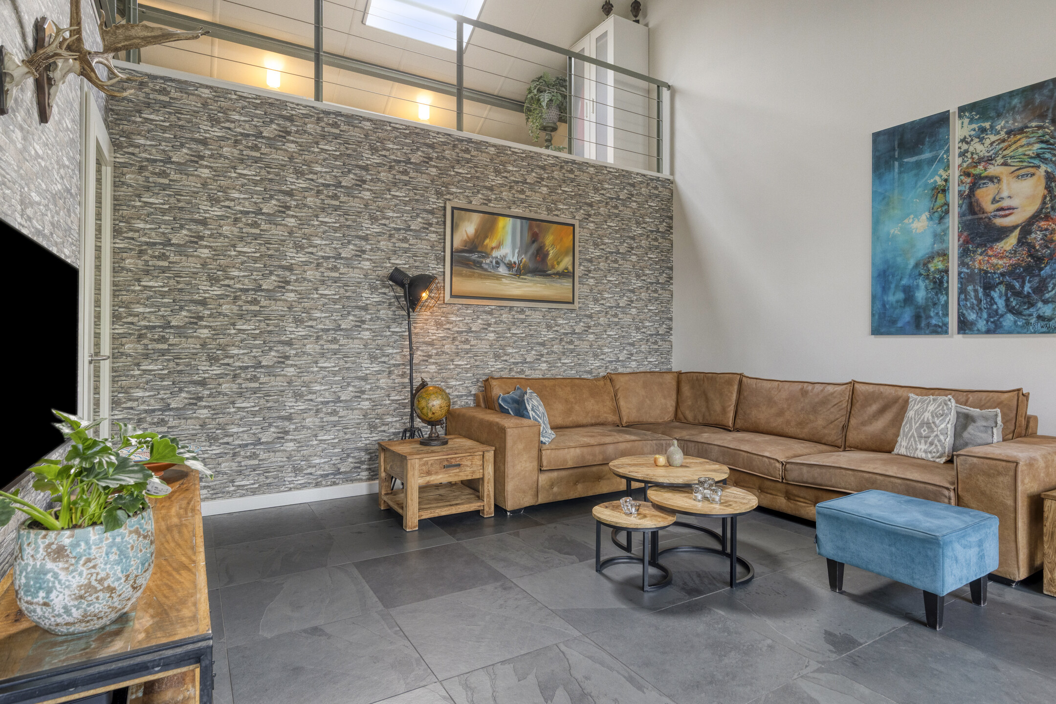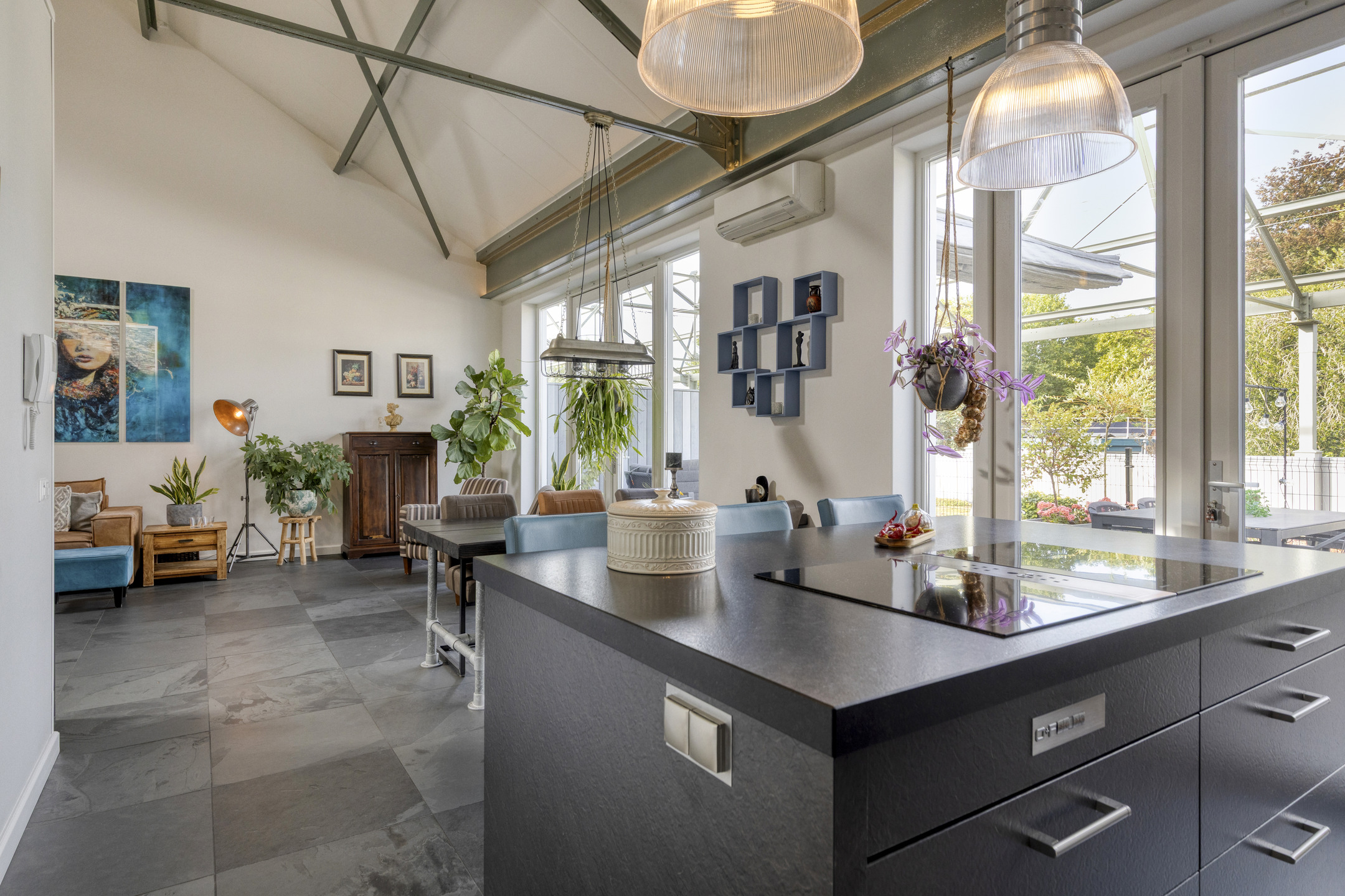 De loftwoning beschikt over een royale woonkamer met grote raampartijen, die zorgen voor veel lichtinval en een prachtig uitzicht op het dakterras. Dankzij het vrije zicht en de hoge plafonds ademt de ruimte luxe en openheid, waardoor het appartement de uitstraling en beleving van een penthouse krijgt.