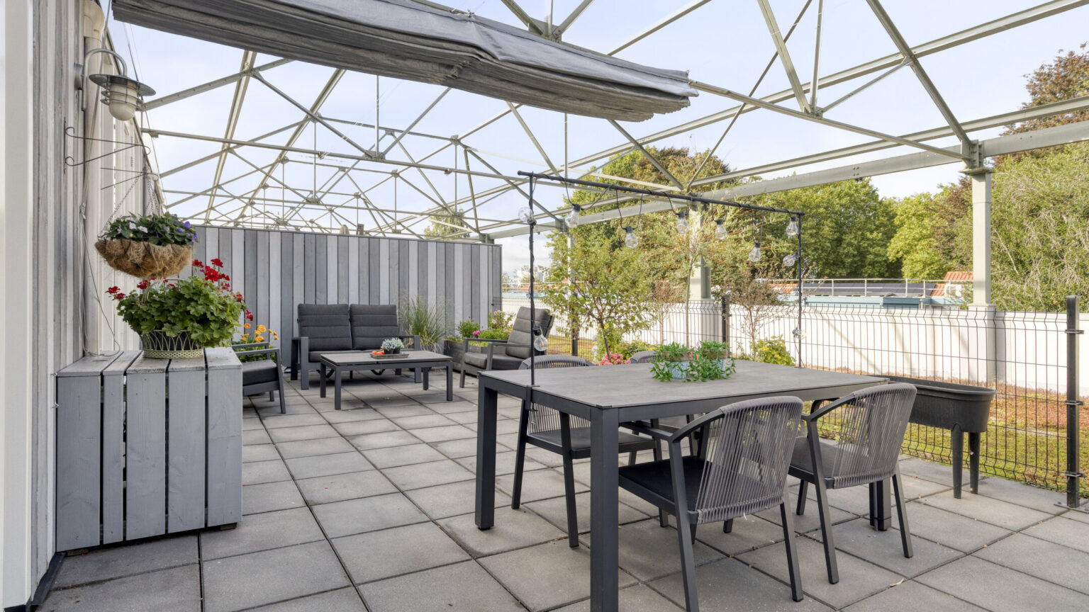 Het terras is een van de grootste pluspunten van dit appartement. Over de volledige breedte van de woning is hier alle ruimte voor een loungehoek, een grote eettafel of een paar comfortabele ligstoelen. Een unieke plek waar binnen en buiten naadloos in elkaar overlopen.