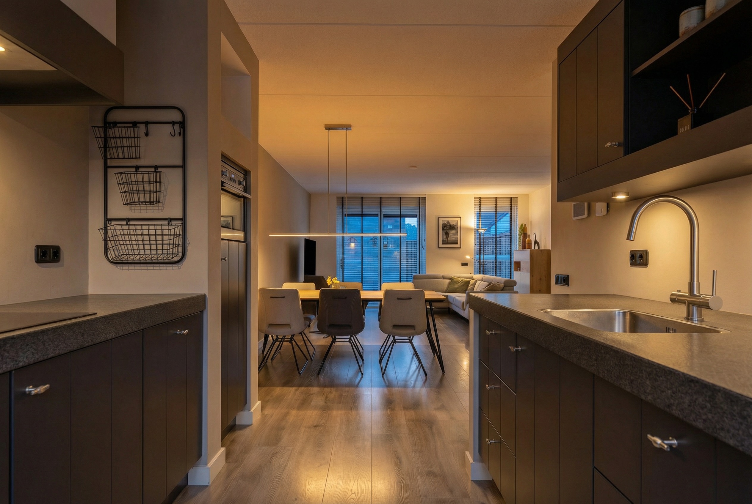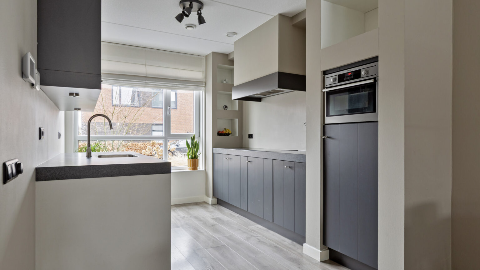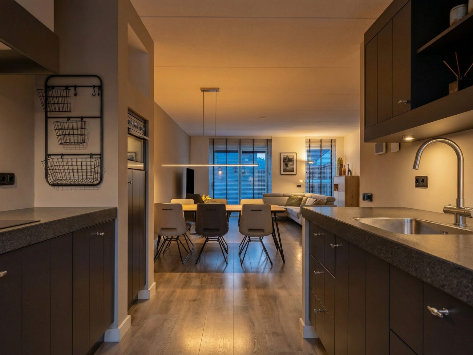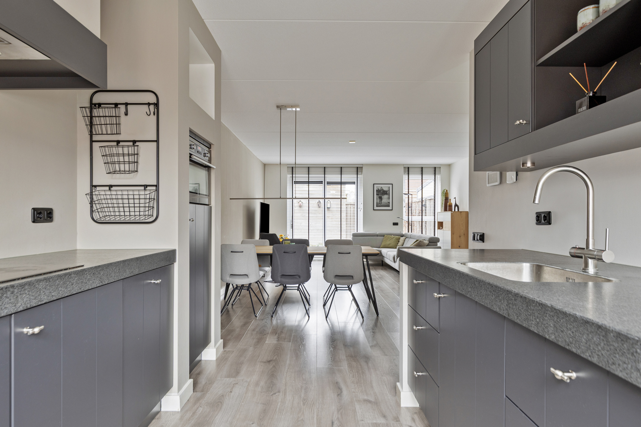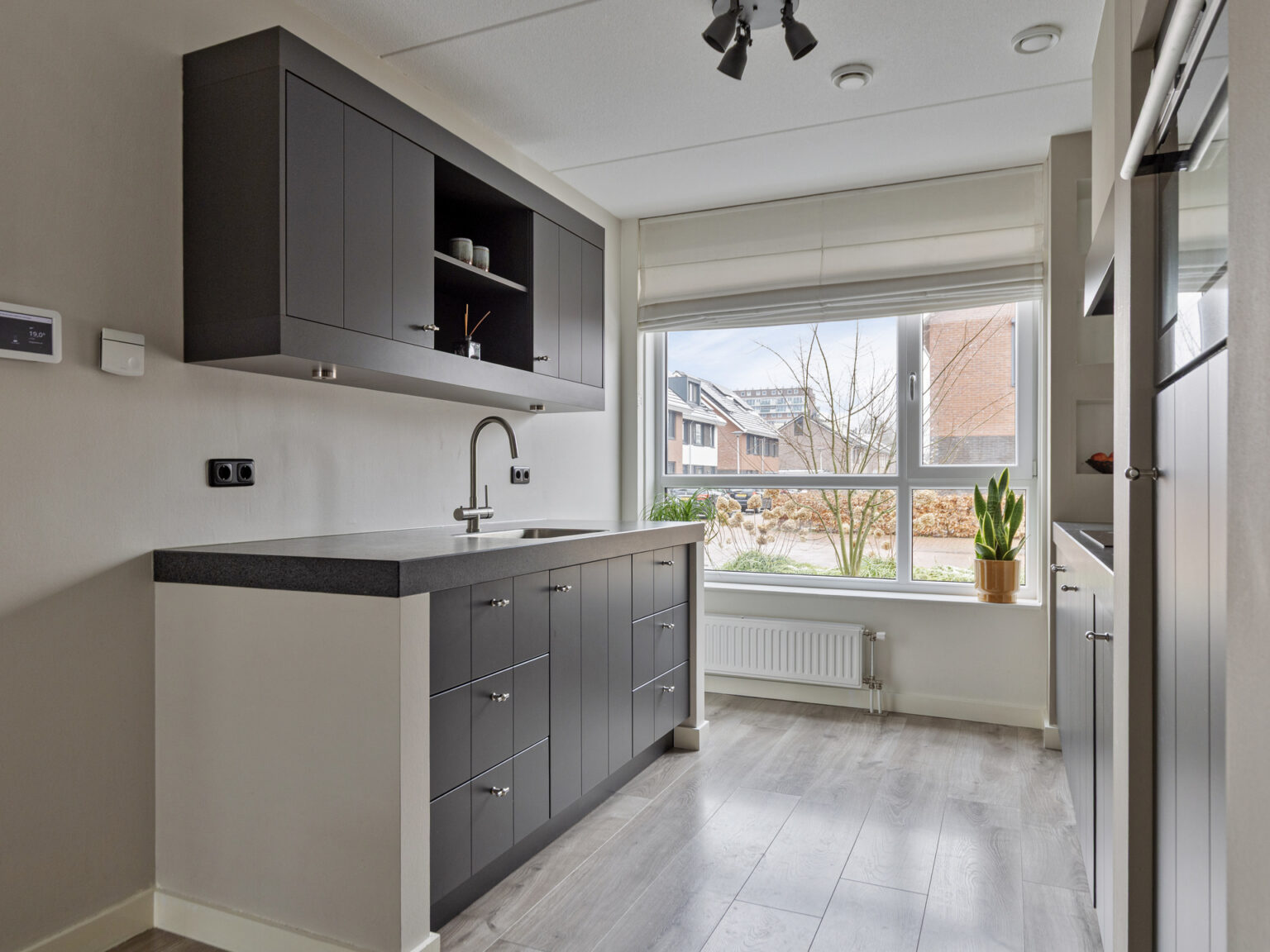 Entree/hal met meterkast, trapopgang en toiletruimte met hangend toilet en fontein. Aan de voorzijde van de woning is een open keuken gerealiseerd voorzien van een inductiekookplaat, afzuigkap, combi-oven/combimagnetron, koelkast, vaatwasser en Quooker. De tuingerichte woonkamer beschikt over een provisiekast onder de trap, veel lichtinval en een schuifpui met toegang tot de zonnige tuin.
