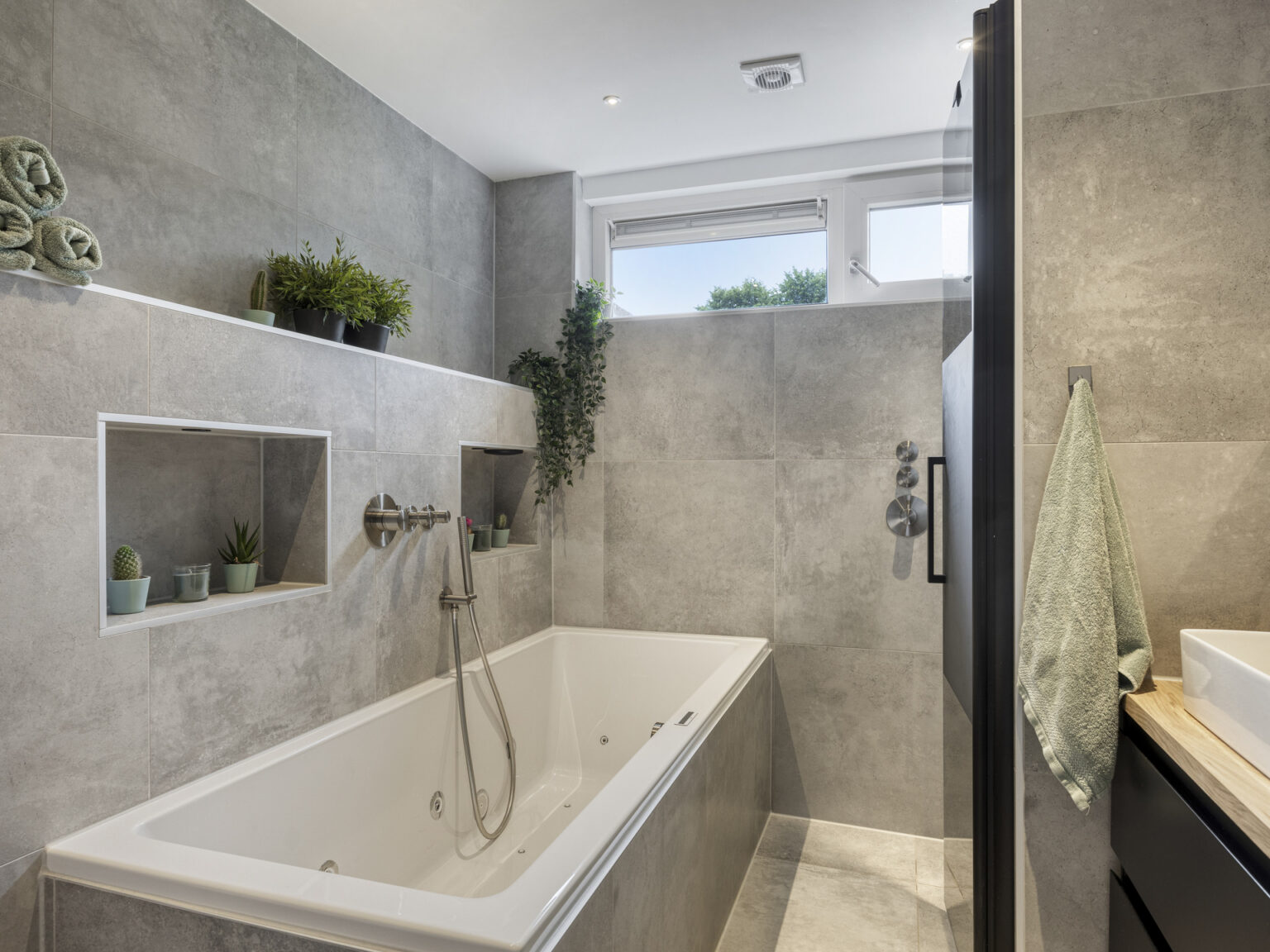 Overloop, drie ruime slaapkamers voorzien van een laminaatvloer, moderne badkamer (2022) met elektrische vloerverwarming, inloopdouche, hangend toilet, wastafel met meubel en een whirpool ligbad. Alle slaapkamers zijn voorzien van screens.