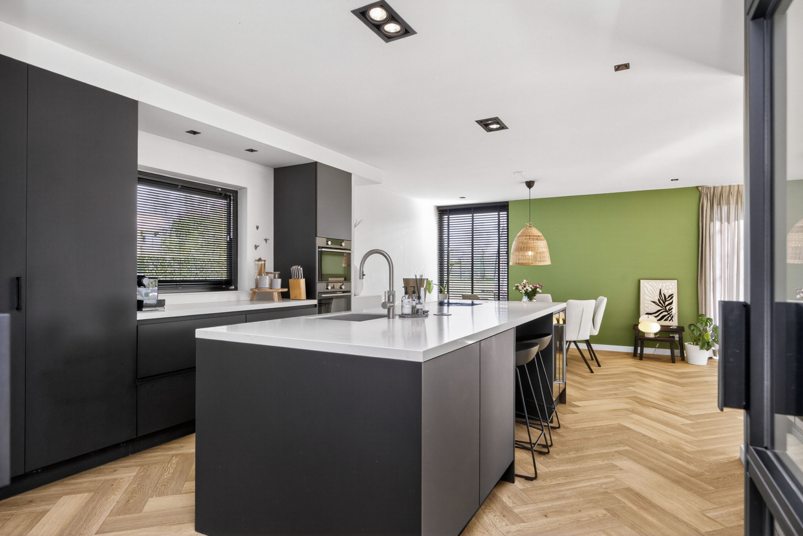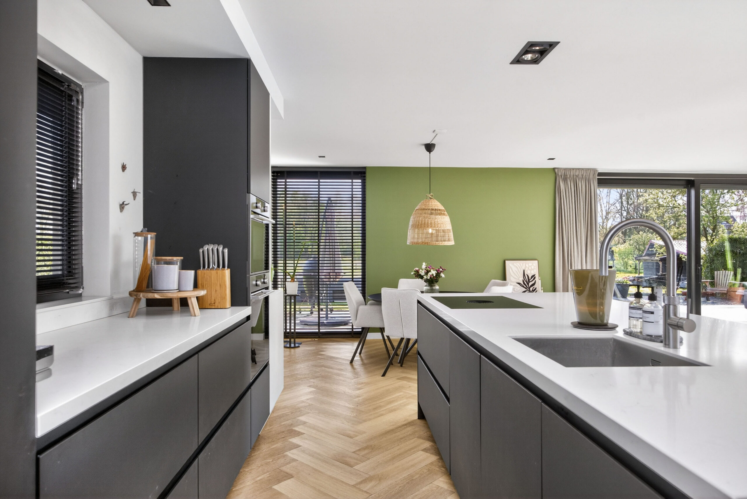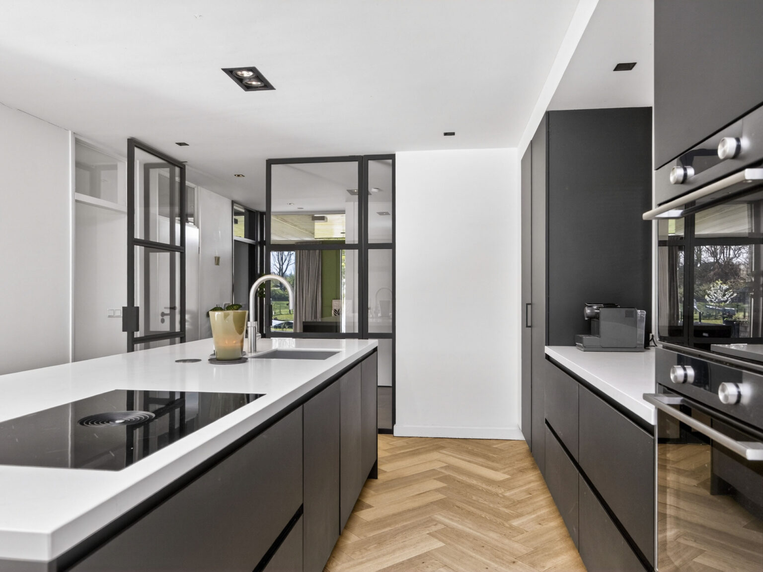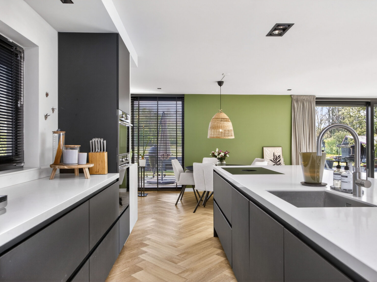 Je komt binnen in de ruime hal afgewerkt met een gietvloer met vloerverwarming, toiletruimte met hangend toilet met fontein en de meterkast. Vanuit de hal is de inpandig te bereiken ruime garage (27,5 m2), het tochtportaal/berging met opstelplaats CV-ketel en deur naar de tuin en de bijkeuken met aansluitingen witgoed te bereiken. Ook is er vanuit de hal toegang tot de gang met daaraan 3 slaapkamers voorzien van een gietvloer en de badkamer met een ligbad, inloopdouche, een hangend toilet en een wastafel met meubel. Wederom bereik je vanuit de entree/hal de fraaie woonkeuken en L-vormige woonkamer met ook een toegang naar de 4e ruime slaapkamer. Deze slaapkamer is voorzien van een PVC-vloer, airco en ook een directe toegang tot de badkamer. De prachtige woonkeuken is voorzien van een spoel- en kookeiland met barfunctie en een composiet aanrechtblad. De keuken is voorzien van inbouwapparatuur: inductiekookplaat met geïntegreerde afzuiging, koelkast, vaatwasser, 3-laden vriezer, een oven en een combi-oven en een klimaatkast. De woonkeuken staat in open verbinding met de ruime woonkamer afgewerkt met een PVC-vloer met vloerverwarming en biedt een open haard en een schuifpui naar het terras. Vanuit de woonkeuken en de woonkamer heeft u een prachtig weids uitzicht op groen en een zeer fraaie lichtinval door de situering op het zuidwesten!