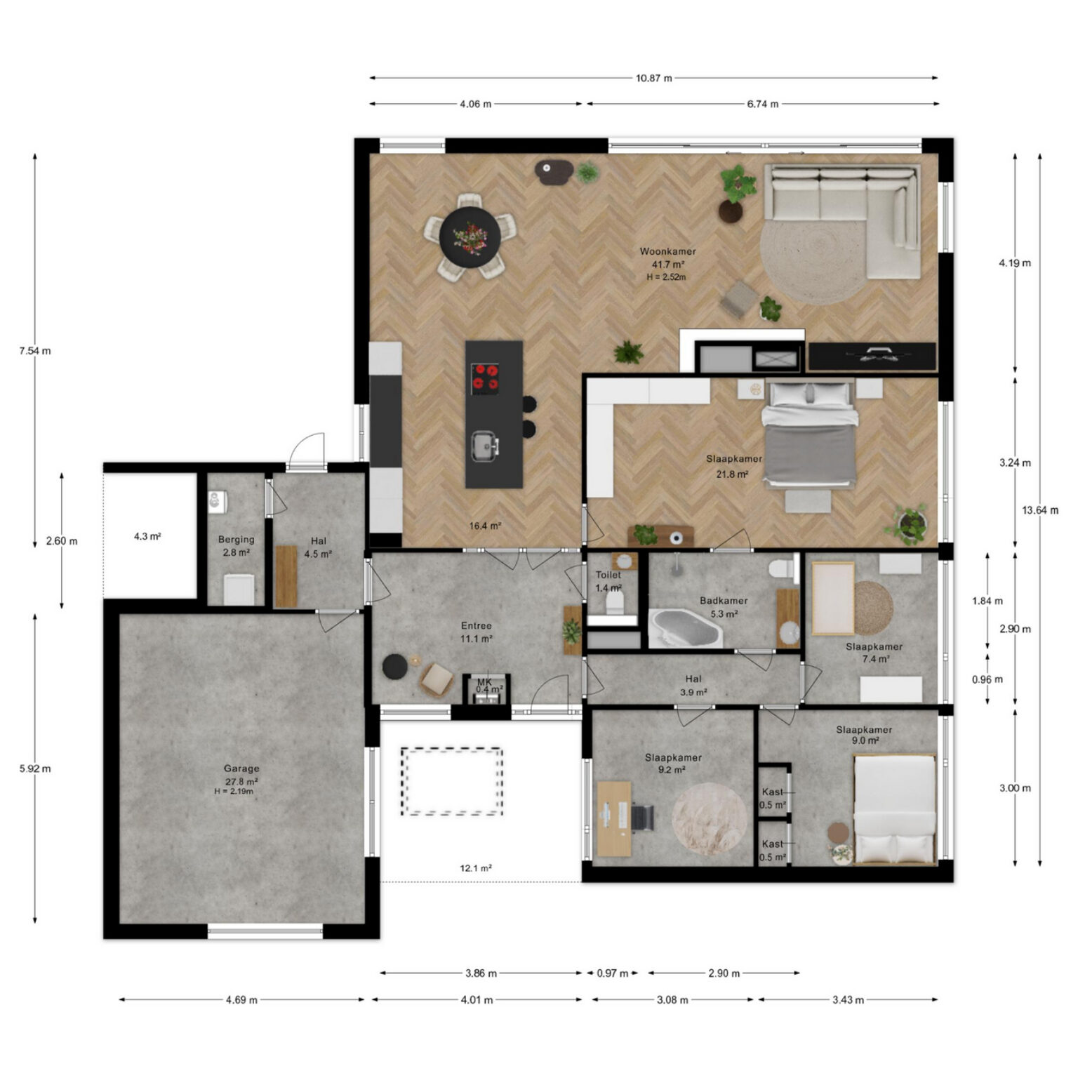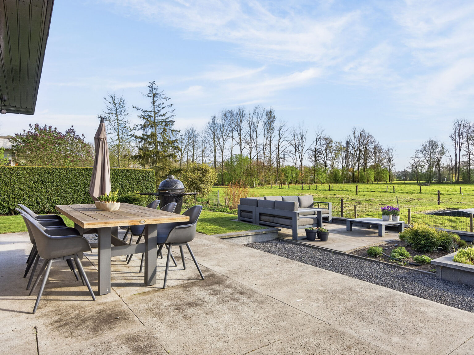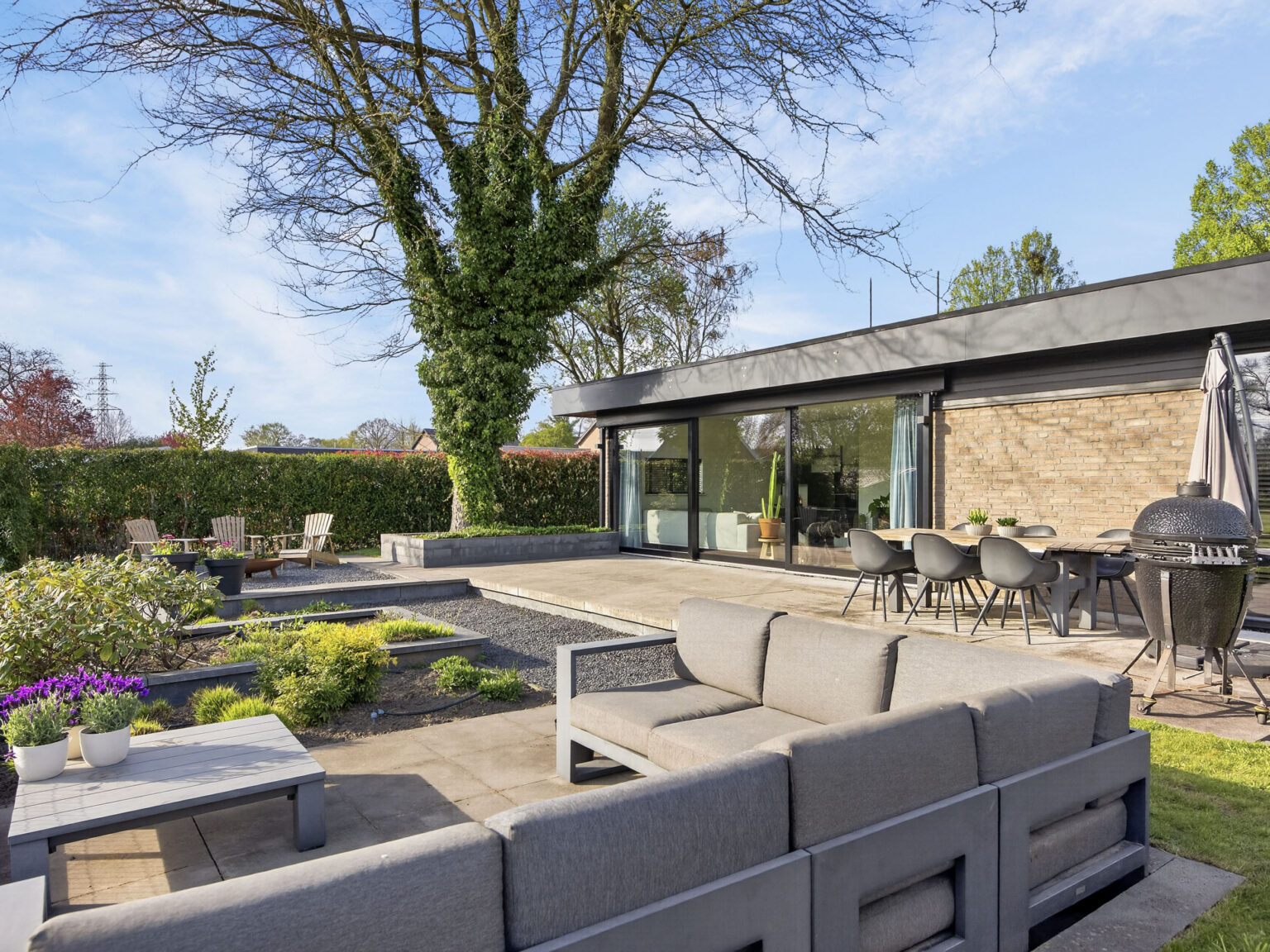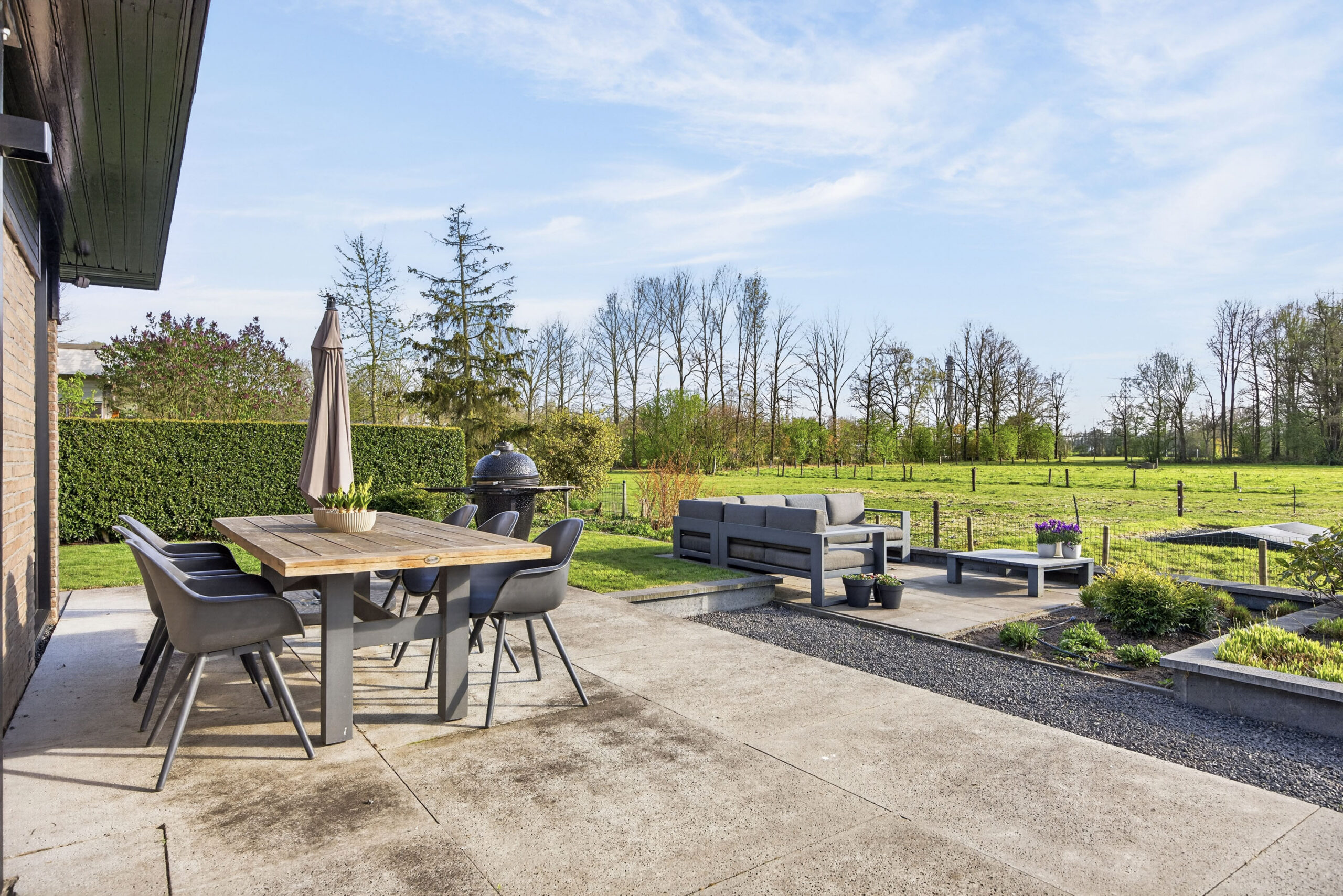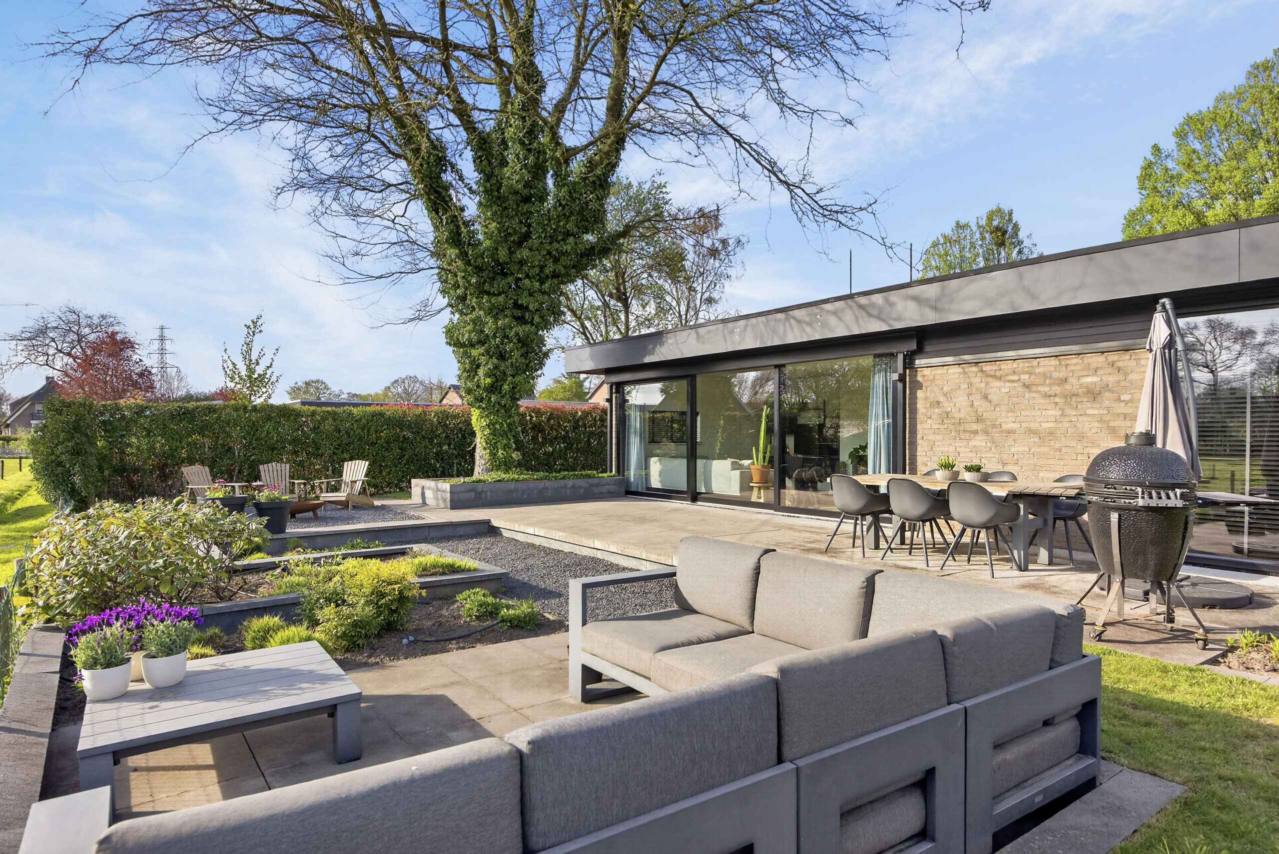 Je komt binnen in de ruime hal afgewerkt met een gietvloer met vloerverwarming, toiletruimte met hangend toilet met fontein en de meterkast. Vanuit de hal is de inpandig te bereiken ruime garage (27,5 m2), het tochtportaal/berging met opstelplaats CV-ketel en deur naar de tuin en de bijkeuken met aansluitingen witgoed te bereiken. Ook is er vanuit de hal toegang tot de gang met daaraan 3 slaapkamers voorzien van een gietvloer en de badkamer met een ligbad, inloopdouche, een hangend toilet en een wastafel met meubel. Wederom bereik je vanuit de entree/hal de fraaie woonkeuken en L-vormige woonkamer met ook een toegang naar de 4e ruime slaapkamer. Deze slaapkamer is voorzien van een PVC-vloer, airco en ook een directe toegang tot de badkamer. De prachtige woonkeuken is voorzien van een spoel- en kookeiland met barfunctie en een composiet aanrechtblad. De keuken is voorzien van inbouwapparatuur: inductiekookplaat met geïntegreerde afzuiging, koelkast, vaatwasser, 3-laden vriezer, een oven en een combi-oven en een klimaatkast. De woonkeuken staat in open verbinding met de ruime woonkamer afgewerkt met een PVC-vloer met vloerverwarming en biedt een open haard en een schuifpui naar het terras. Vanuit de woonkeuken en de woonkamer heeft u een prachtig weids uitzicht op groen en een zeer fraaie lichtinval door de situering op het zuidwesten!