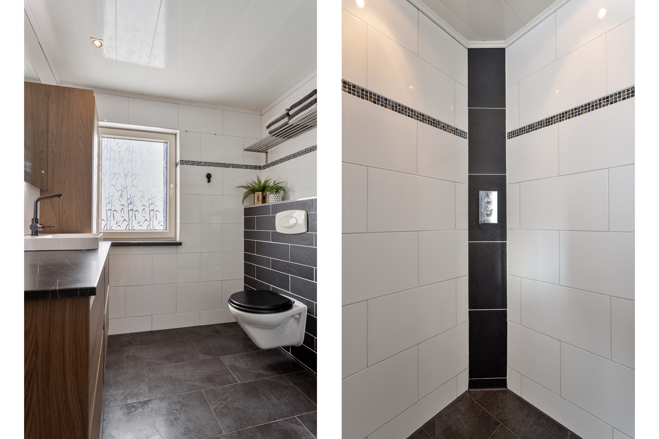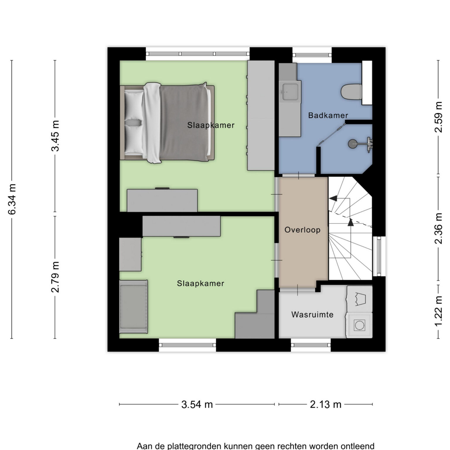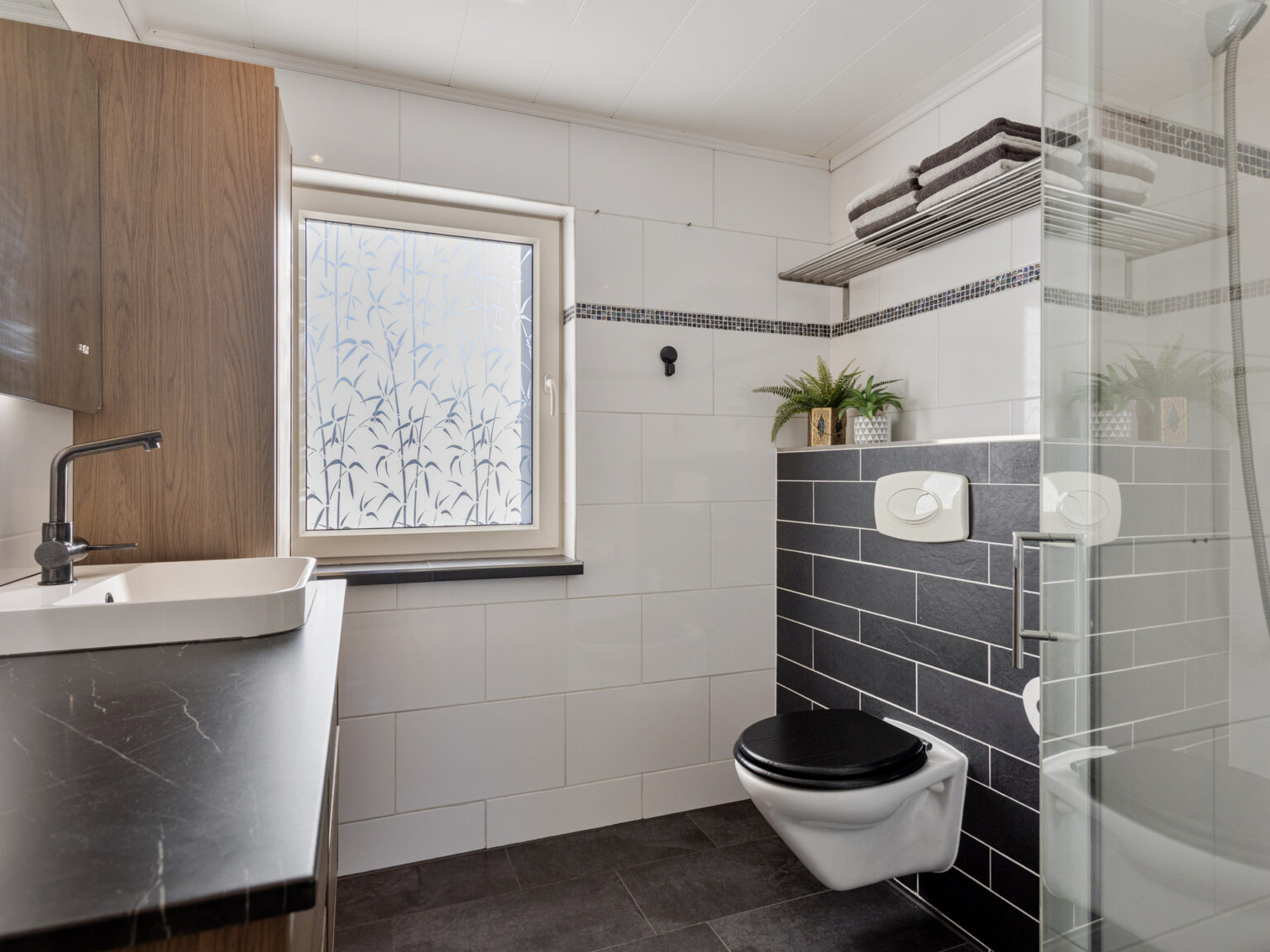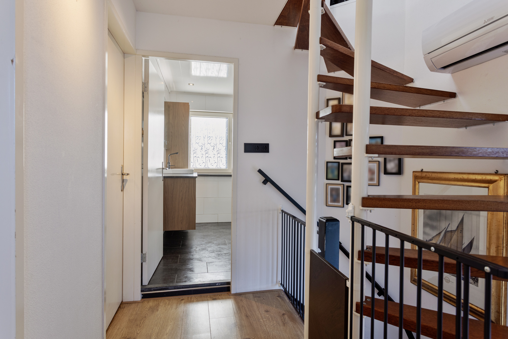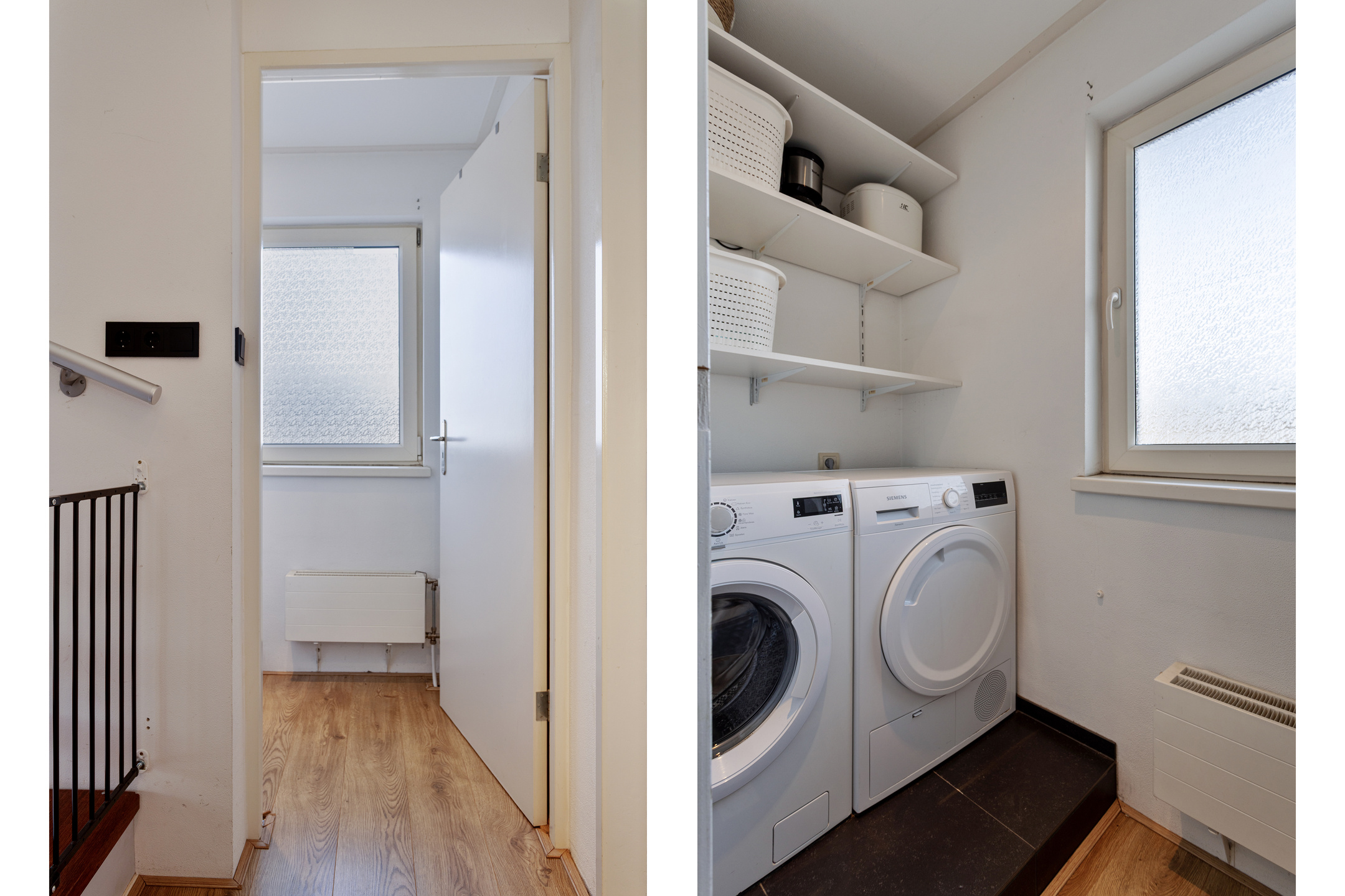 De overloop geeft toegang tot de badkamer en twee ruime, comfortabele slaapkamers. De badkamer is voorzien van een wastafel met meubel, inloopdouche en zwevend toilet. Daarnaast is er een aparte wasruimte met witgoedaansluitingen.