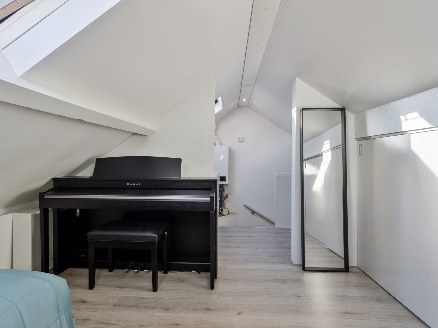 De tweede verdieping biedt een voorzolder met CV-opstelling en een derde slaapkamer met praktische bergruimte achter de knieschotten. Dankzij de slimme indeling is deze verdieping uitstekend te gebruiken als volwaardige slaapkamer, werkruimte of hobbykamer.