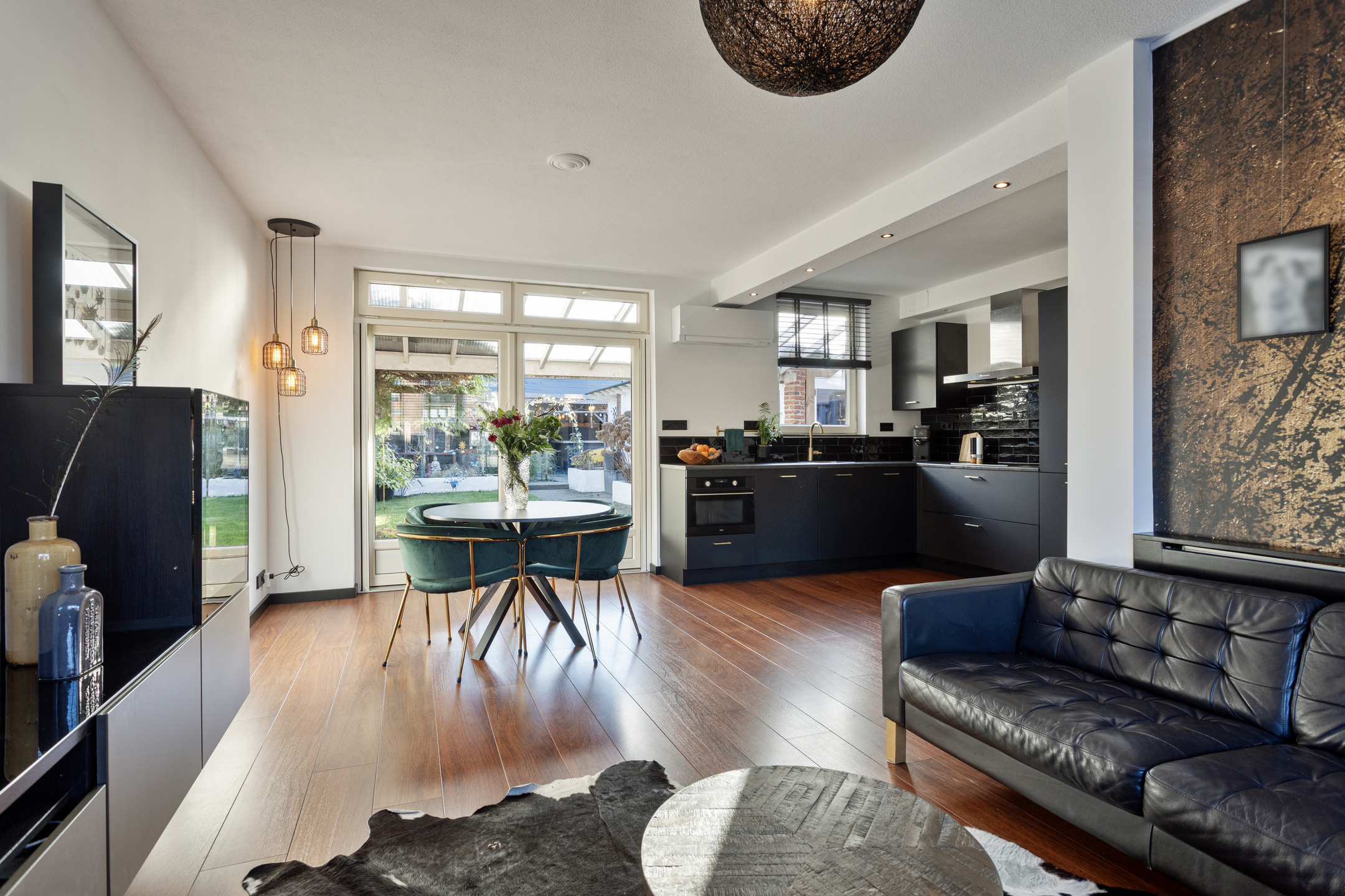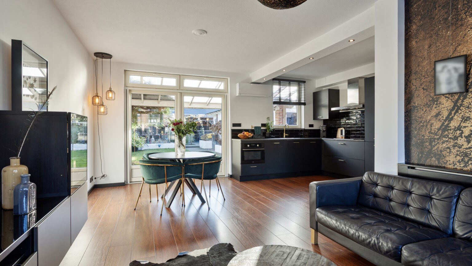 Via de entree kom je binnen in de hal met meterkast en een separaat toilet. Vanuit hier loop je door naar de lichte en sfeervolle woonkamer, waar zit- en eethoek op een prettige manier met elkaar zijn verbonden. Aan de achterzijde openen dubbele deuren naar de veranda. De open keuken is in 2023 vernieuwd en voorzien van een inductiekookplaat met afzuigkap, combi-oven en koel-/vriescombinatie en vormt een fijne plek om te koken met zicht op de leefruimte.