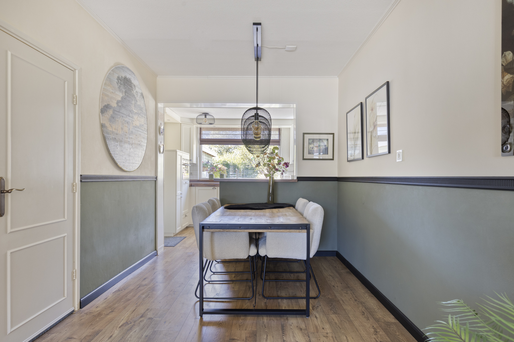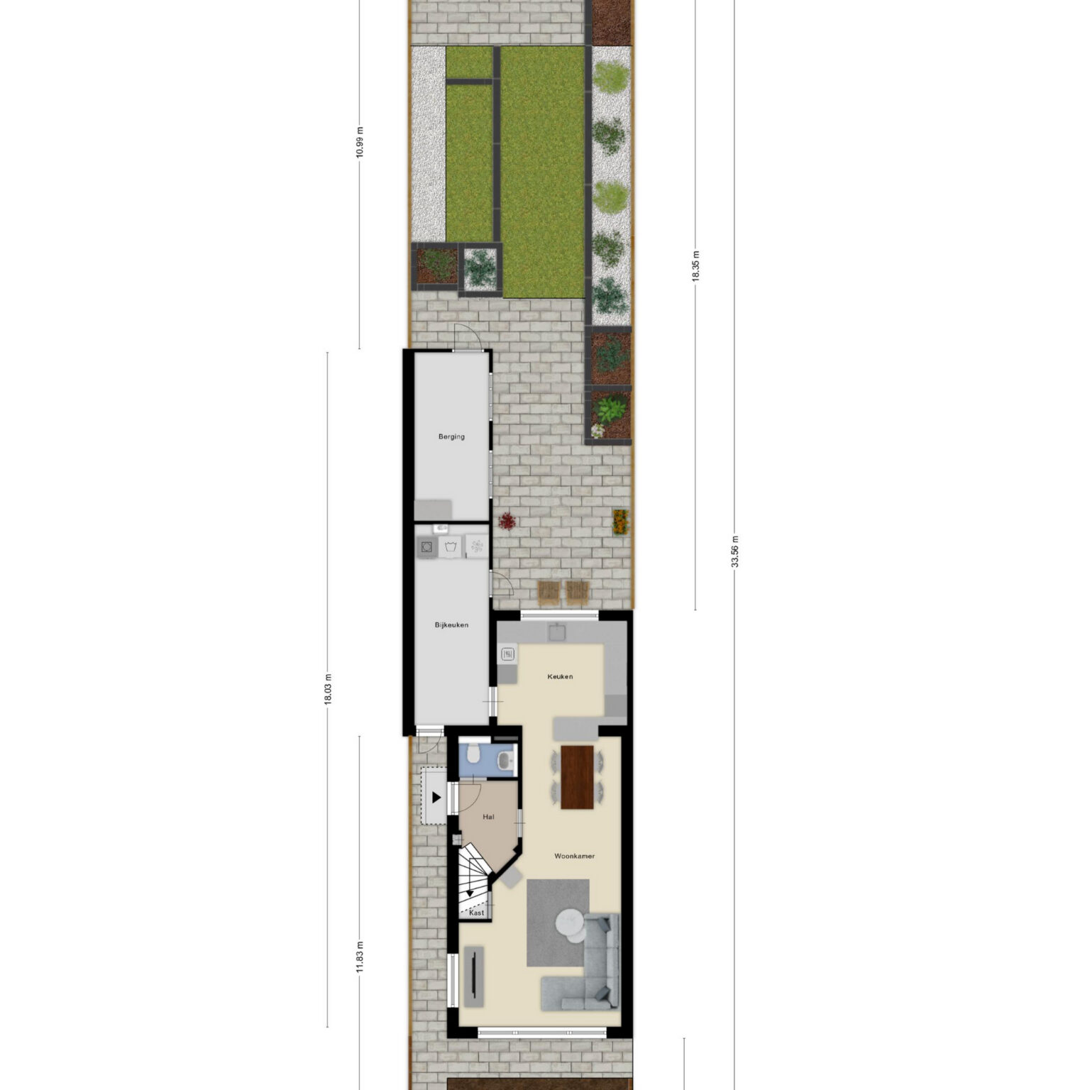Je komt binnen in de hal, waar je direct toegang hebt tot het toilet, de meterkast en de trap naar boven. Vanuit hier loop je door naar de lichte woonkamer, die zich aan de voorkant bevindt. Vanuit de woonkamer loop je langs het eetgedeelte naar de halfopen keuken, aan de achterkant van de woning met uitzicht op de tuin. Door de halfopen keuken sta je in verbinding met de eetkamer, wat zorgt voor een prettig geheel. Vanuit de keuken loop je door naar de praktische bijkeuken, waar je extra bergruimte en aansluitingen voor witgoed vindt. Aansluitend bereik je de berging, ideaal voor fietsen en opslag.