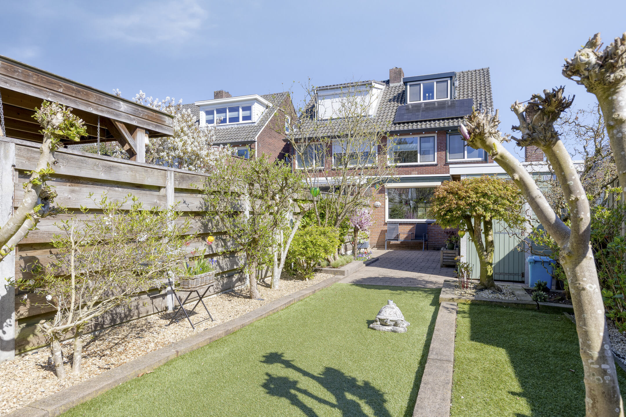 De onderhoudsvriendelijke, diepe achtertuin is gunstig gelegen op het westen, waardoor je hier volop van de middag- en avondzon geniet. Vanuit de bijkeuken en de berging stap je zo het terras op. Via het verzorgde kunstgras bereik je het achtergelegen terras, waar een fijne combinatie van bestrating en groen zorgt voor zowel zonnige als schaduwrijke plekken.