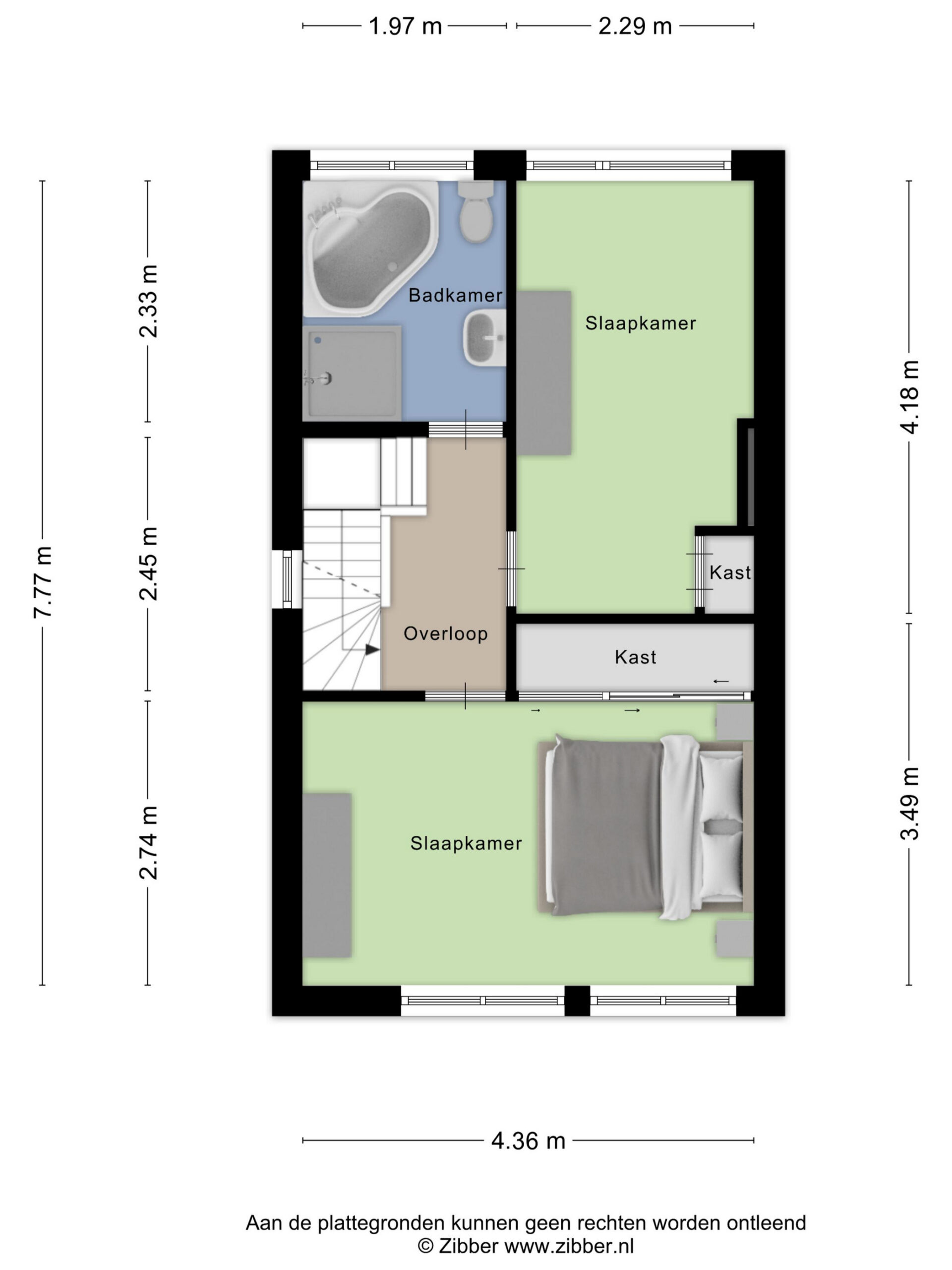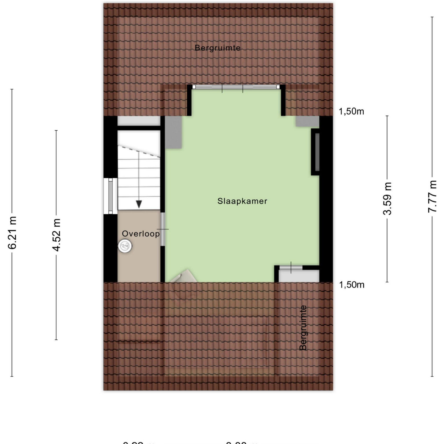 Een vaste trap brengt je naar de tweede verdieping. Hier kom je op de overloop, met toegang tot een ruime zolderkamer. Dankzij het dakkapel voelt deze verdieping verrassend licht en ruim aan, waardoor je hier eenvoudig een volwaardige slaapkamer, werkruimte of hobbykamer kun realiseren. Achter de knieschotten is bovendien praktische bergruimte aanwezig.