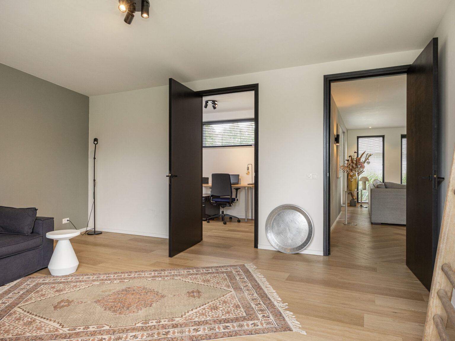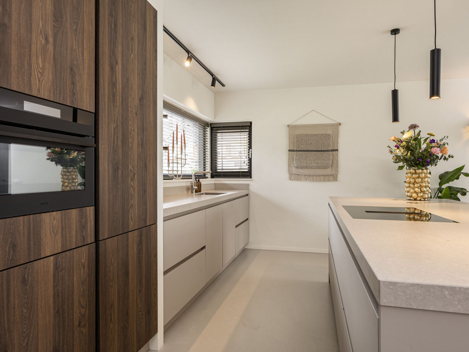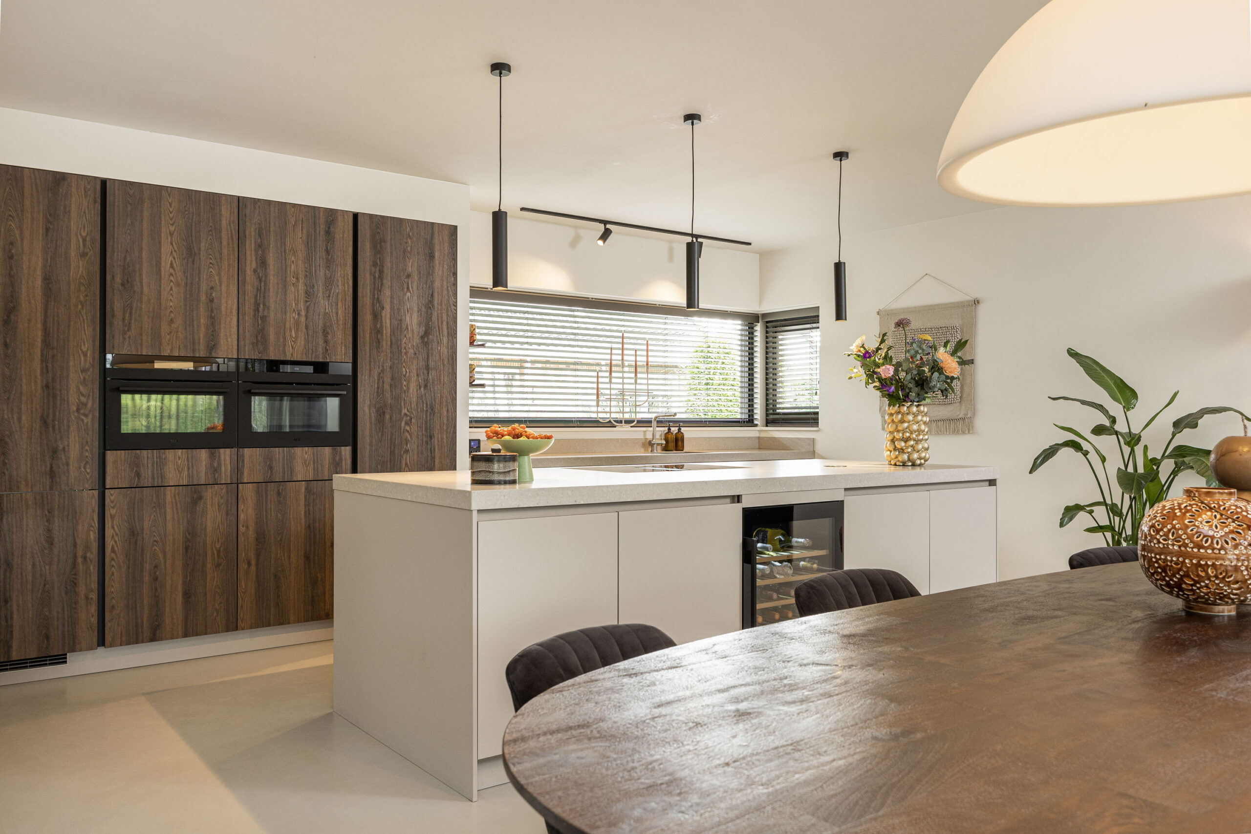 De huidige eigenaren hebben met veel zorg en aandacht bijzonder goede keuzes gemaakt op het gebied van o.a. architectuur, indeling, gebruiksgemak en het afwerkingsniveau. De plattegrond voelt logisch en prettig aan, met een perfecte combinatie tussen binnen- en buitenleven. De statige entree maakt direct indruk door de plafondhoogte, het hoogwaardige materiaalgebruik en de ruimtelijke beleving. Vanuit de entree betreed je de sfeervolle open woonkeuken met een gietvloer die is ontworpen met oog voor het gezellig samenzijn. De luxe woonkeuken met kookeiland is uitgevoerd in een lichte kleurstelling, met een granieten aanrechtblad en beschikt over alle wenselijke apparatuur; een stoomoven, een combi-oven, (voorbereiding) quooker, koelkast en een inductie kookplaat met geïntegreerde afzuiging. Naast de gangbare apparatuur vind je hier ook een wijnklimaatkast. De open woonkeuken is perfect voor lange diners, borrels of gewoon gezellig samenzijn. Via de openslaande tussendeuren bereik je de lichte en ruime woonkamer met visgraat PVC vloer, een schuifpui naar de overkapping en een toegang naar de slaapkamer/werkkamer/2e woonkamer op de begane grond in de rechter vleugel van het woonhuis. Met het oog op de toekomst is de ruimte naast deze slaapkamer (nu in gebruik als kantoor) om te bouwen naar een badkamer. De aansluitingen zijn reeds door de huidige eigenaren aangelegd. De gehele begane grond (inclusief garage) is voorzien van vloerverwarming.