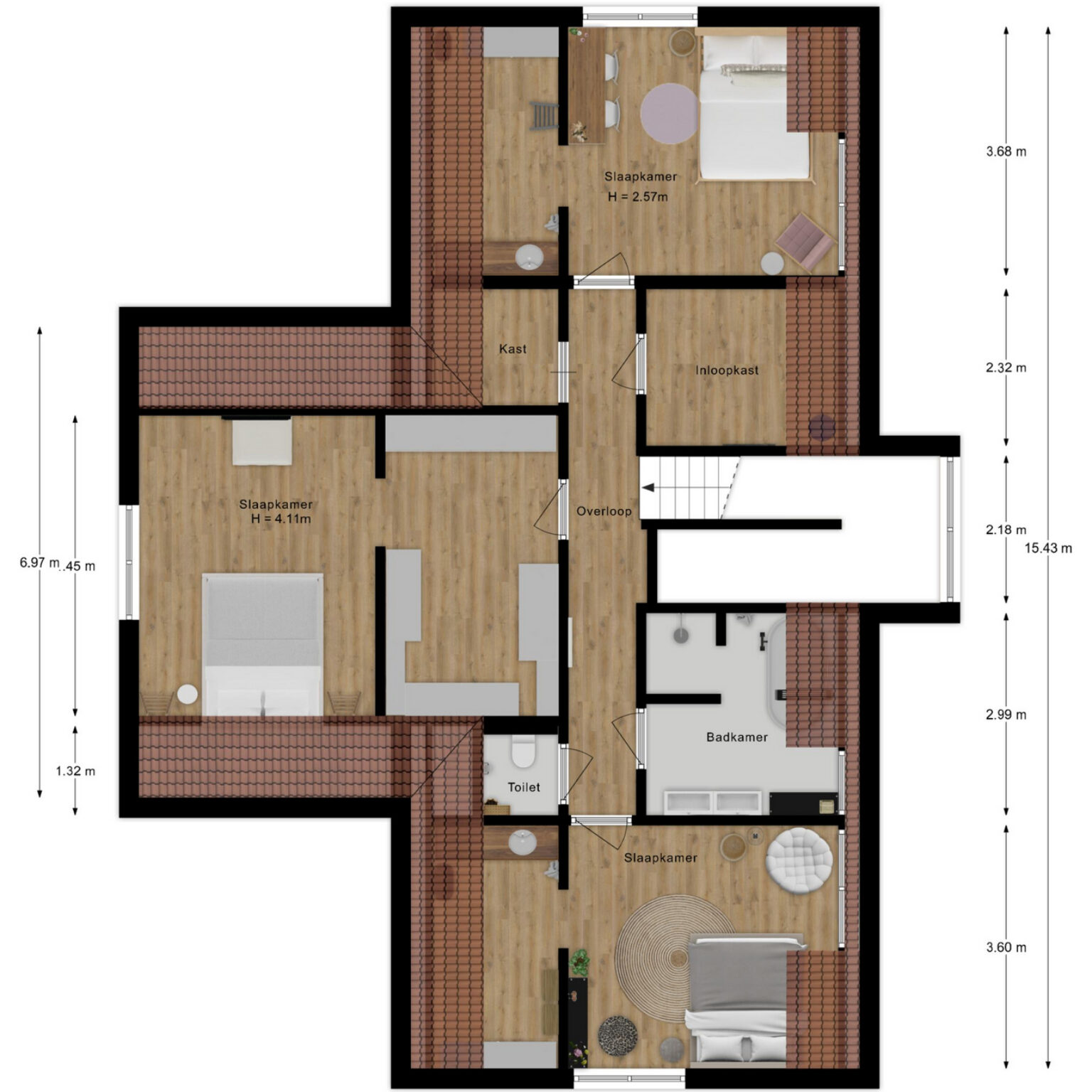 We nemen je mee terug naar de imposante hoofd entree. Hier bevindt zich een toilet met fontein, garderobenis en de vaste trap naar de bovenverdieping. Boven is er een ruime overloop met vide die toegang geeft tot de 3 slaapkamers, de badkamer, een tweede toilet, kastruimte en een extra bergruimte. De hoofdslaapkamer is royaal en voorzien van een inloopkast. Aan weerszijden van de villa bevinden zich 2 identieke slaapkamers qua maatvoering met ieder een eigen doorloop naar een inloopkast met een wastafel met meubel. De hoogwaardig afgewerkte badkamer is een echte eyecatcher uitgevoerd met een inloopdouche, dubbele wastafel en een apart ligbad waarin je kan “baden in luxe”.