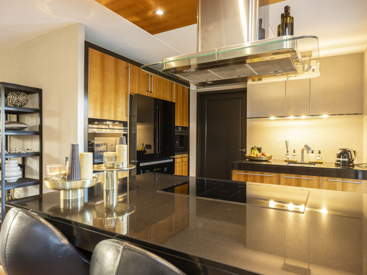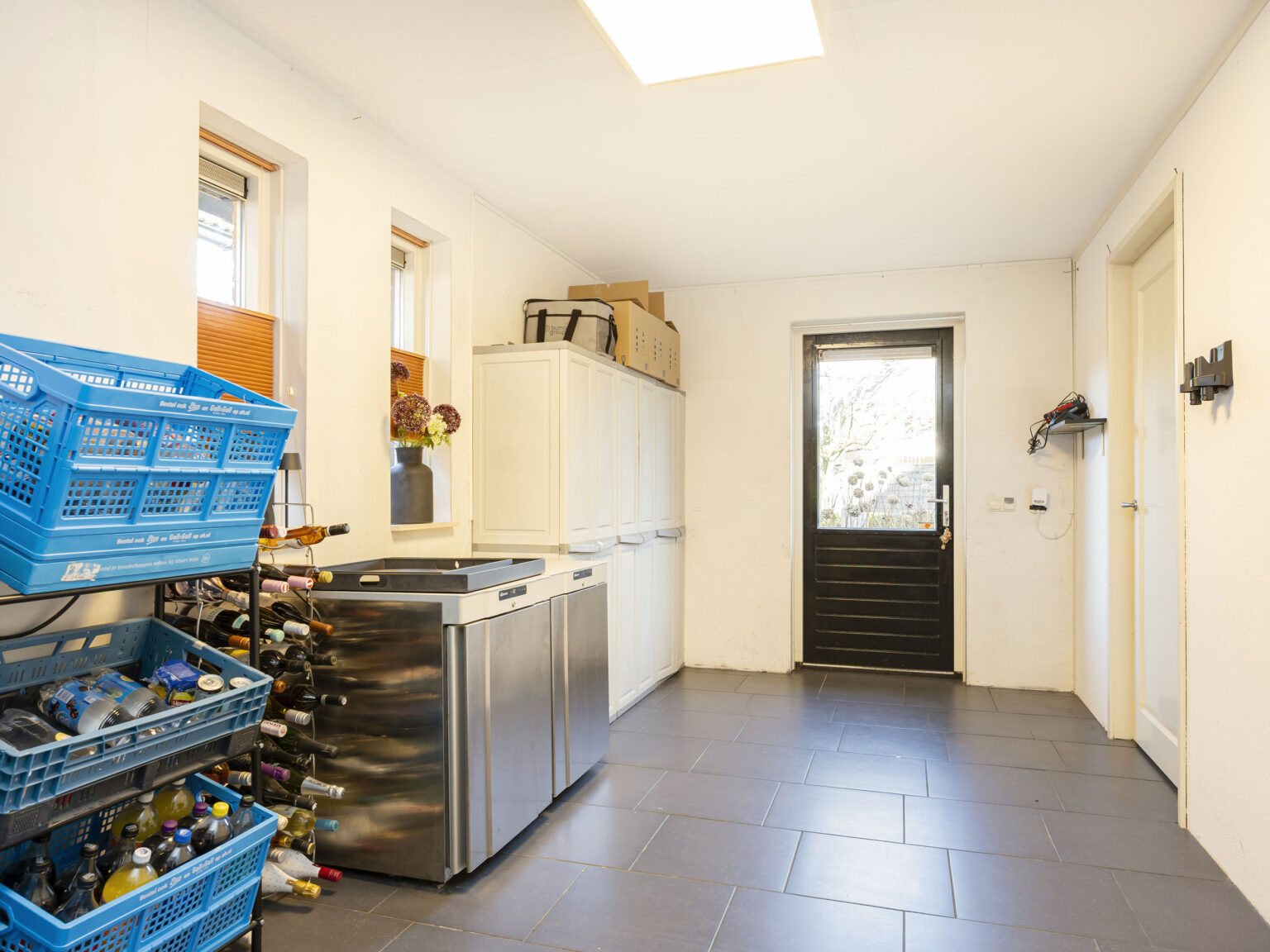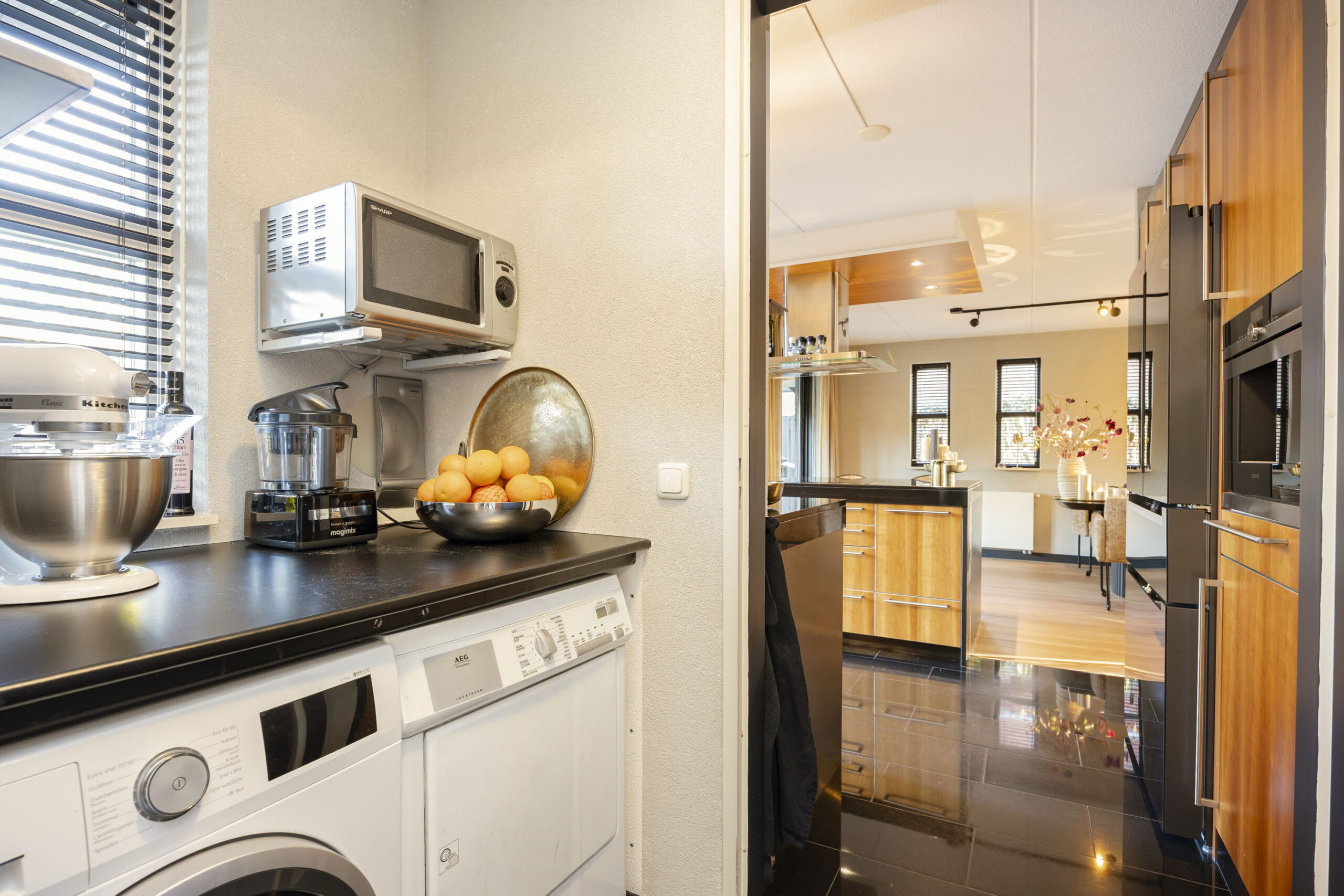 Entree/hal met trapopgang, meterkast en hangend toilet met fontein. Vanuit de hal bereik je de ruime en sfeervol afgewerkte woonkamer, voorzien van een parketvloer. De straatgerichte L-vormige woonkamer biedt volop ruimte voor een riante zithoek en is uitgerust met een gashaard. Aan de achterzijde bevindt zich de tuingerichte woonkeuken met schiereiland. De moderne woonkeuken is voorzien van een royaal eiland met granieten aanrechtblad en uitgerust met alle denkbare inbouwapparatuur, waaronder een inductiekookplaat, afzuigkap, Amerikaanse inbouwkoelkast met vriezer, oven, magnetron en vaatwasser. Hier is koken werkelijk een feestje! Vanuit de keuken is er toegang tot de achtertuin en tot de praktische bijkeuken met witgoed opstelling. Via de bijkeuken is de berging/garage bereikbaar, voorzien van dubbele deuren naar de oprit.