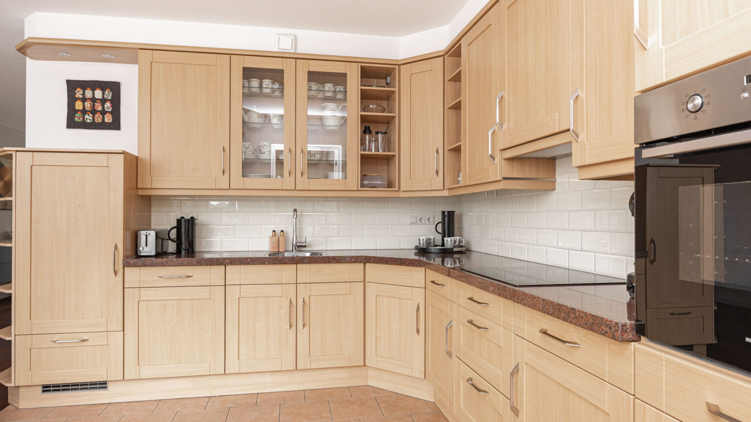 De keuken is uitgevoerd in een hoekopstelling en is voorzien van een granieten blad, 4-pits inductiekookplaat, afzuigkap, oven, vaatwasser en koelkast. Aansluitend aan de keuken vind je een werkkamer/bijkeuken ingericht met een werkblad en warm en koud wateraansluiting/-afvoer. Via de werkkamer is de garage/berging te bereiken, welke is voorzien van een binnenkraan, elektra en een deur naar de achtertuin.