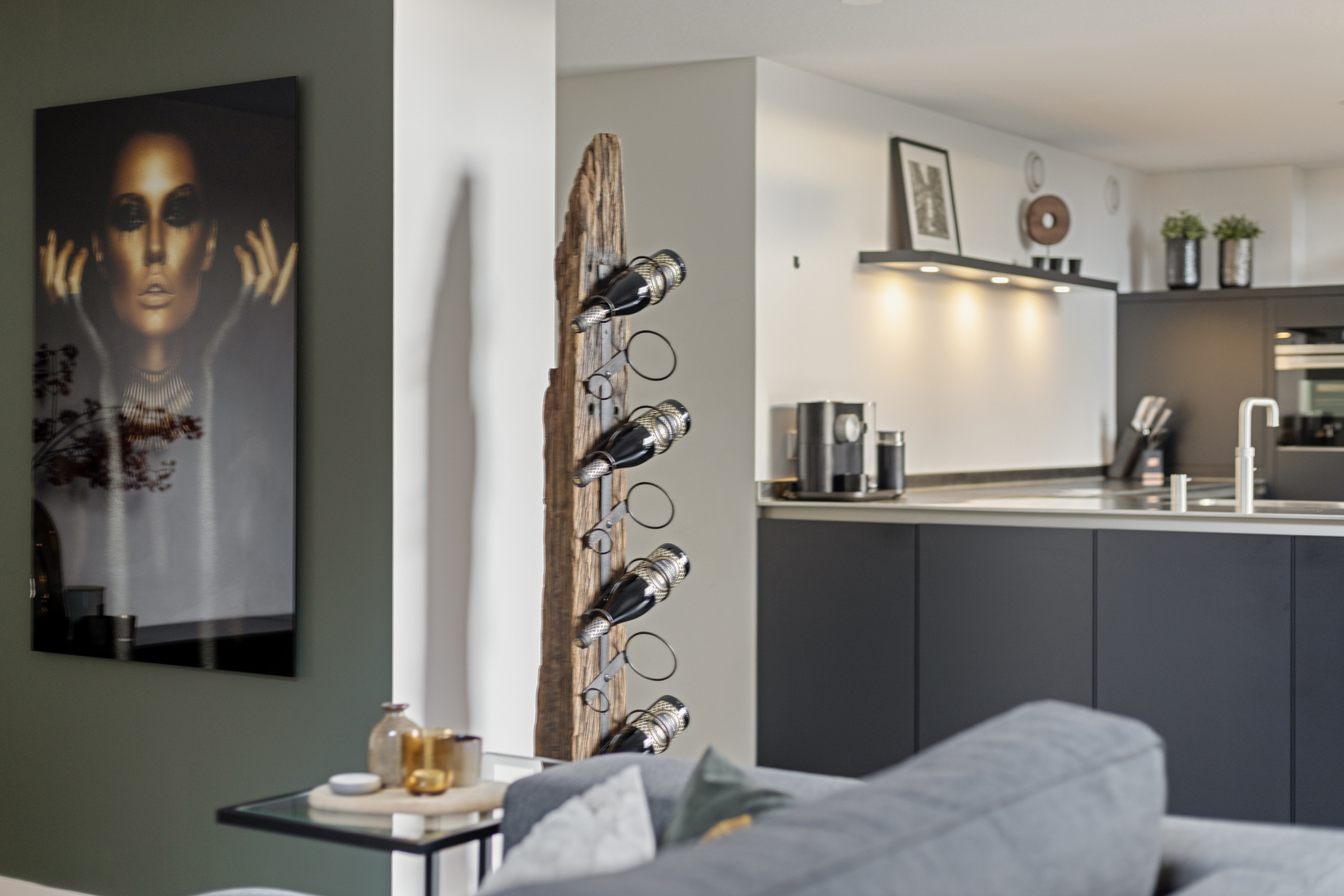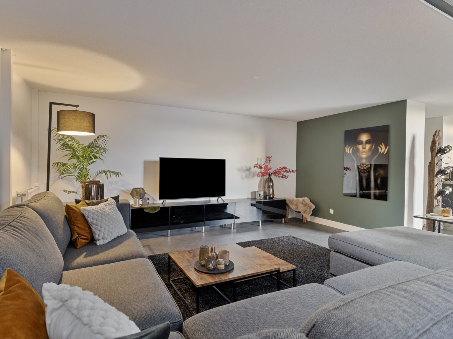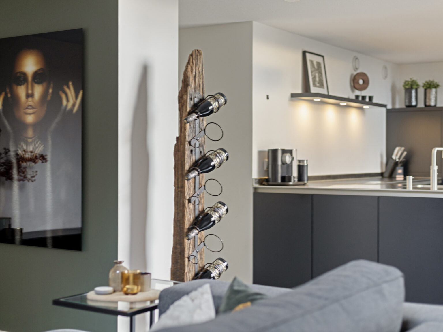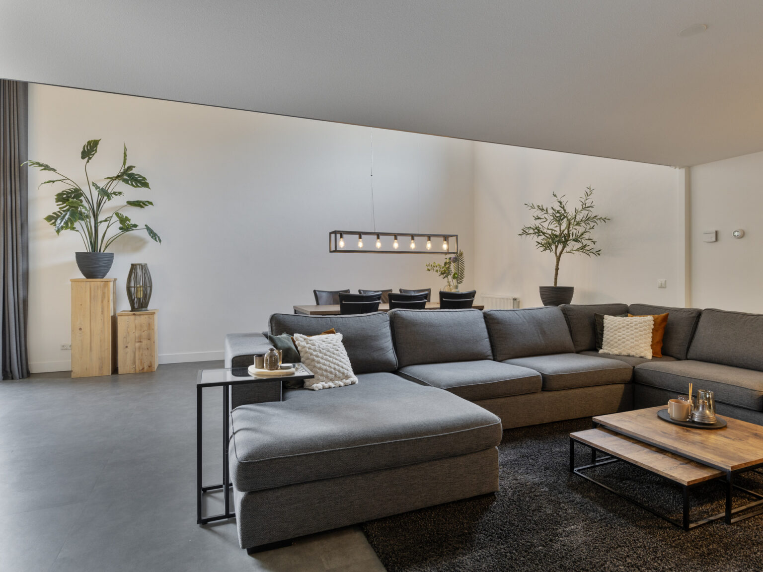 De PVC-vloer loopt ononderbroken door naar de woonkamer en keuken De woonkamer is aangenaam hoog en voorzien van een bijpassend hoog raam. De lichtinval is hierdoor erg prettig. Er is ruimte voor zowel een ruime zithoek alsook een grote eetkamertafel. Aangrenzend bevindt zich de moderne open keuken met luxe (inbouw)apparatuur waaronder een inductie kookplaat, combi magnetron – oven, stoomoven, koelkast, vriezer, vaatwasser, Quooker en een zwevende afzuigkap. Hier komen gezelligheid en koken samen aan een geïntegreerde bar.