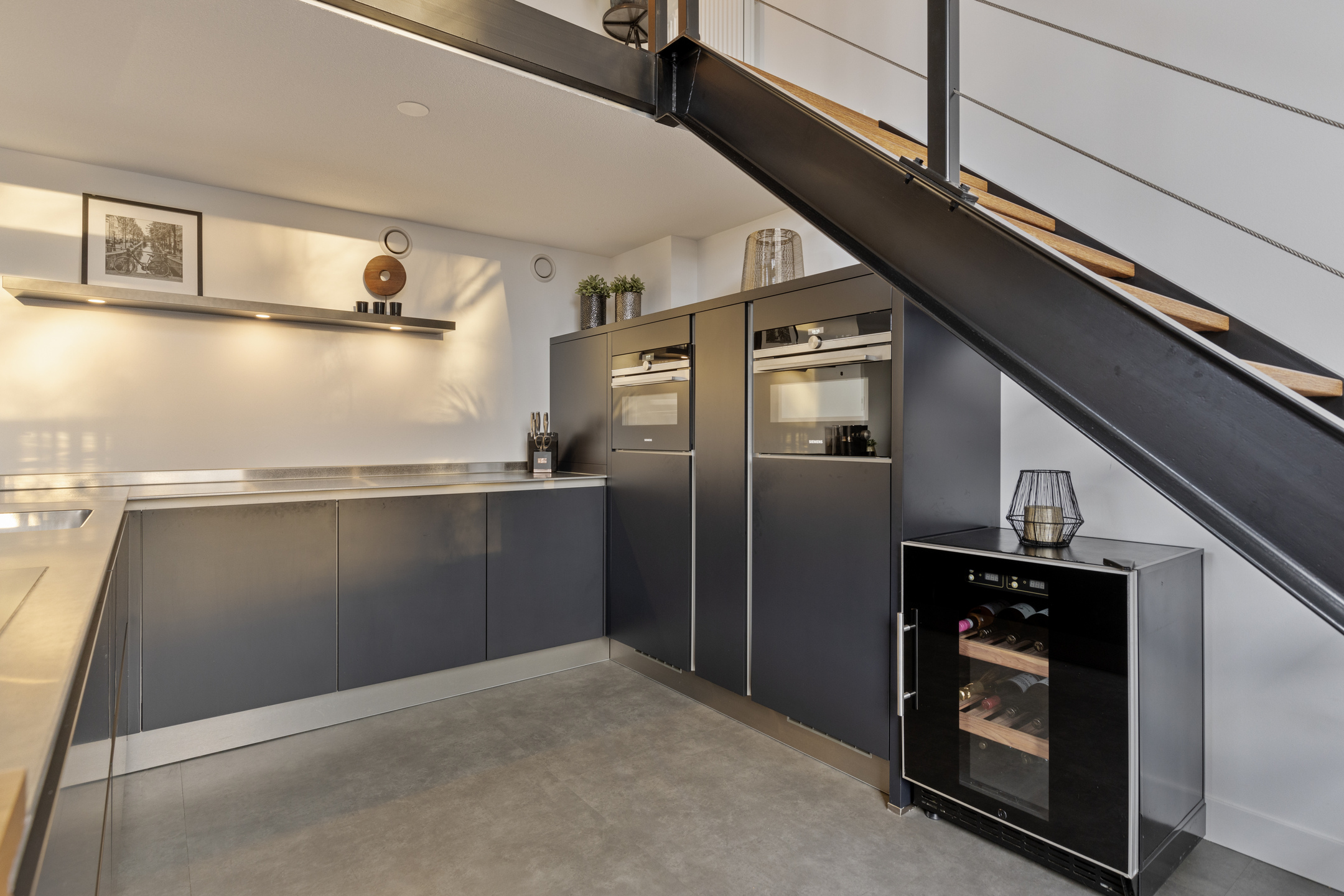 De stijlvolle, open stalen trap met houten treden en balustrade valt meteen op. Deze leidt naar de entresol met uitzicht op de woon/eetkamer. Je vindt er het riante slaapgedeelte met comfortabele inloopkast. Dezelfde vloer en strak afgewerkte muren geven het geheel een zeer verzorgde uitstraling. Dankzij het hoge raam geniet je er van hetzelfde uitzicht als in de woonkamer. Het slim ingedeelde vertrek is verder voorzien een moderne badkamer met doucheruimte, 2e toilet en een dubbel wastafelmeubel.