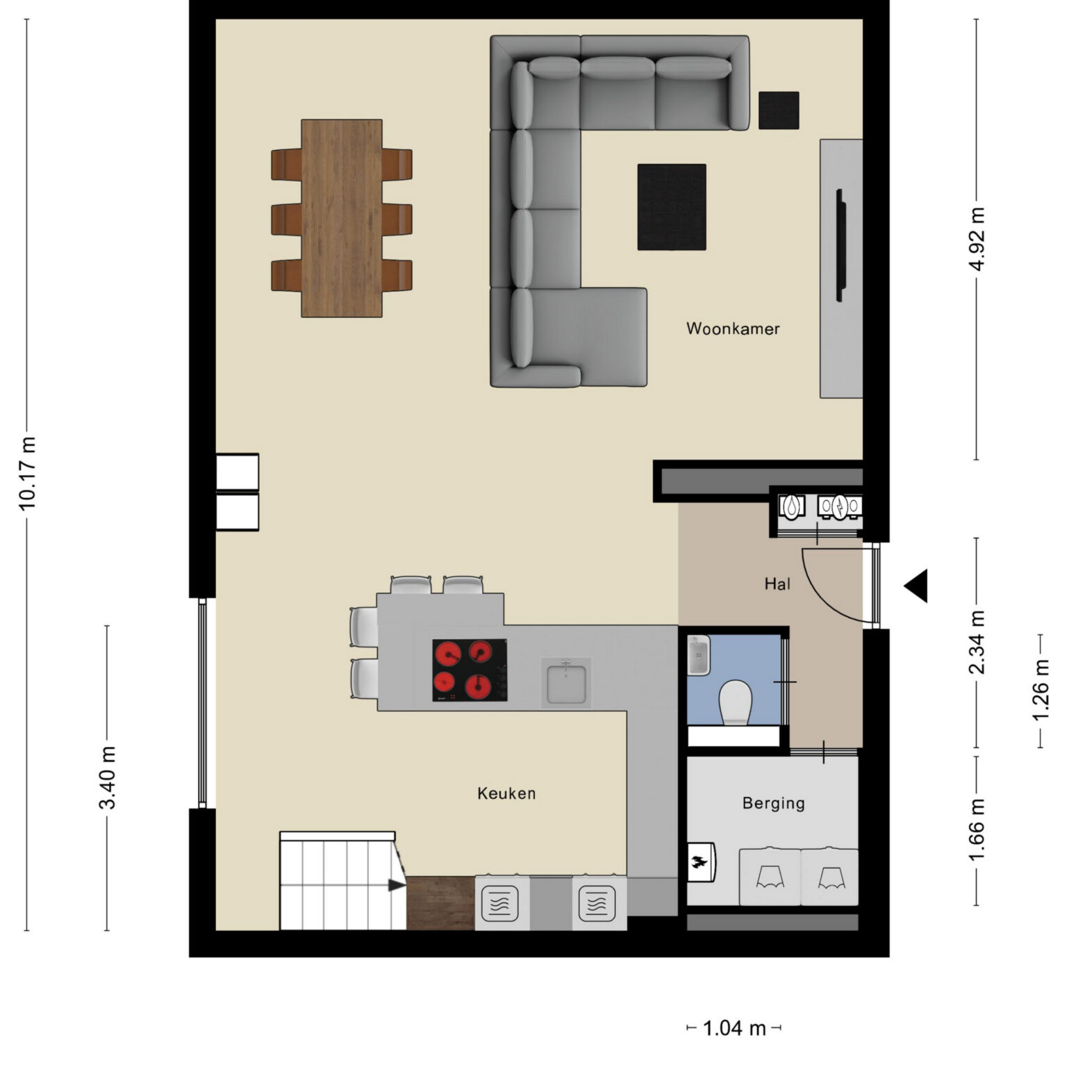 De ruime, gemeenschappelijke entree geeft toegang tot het appartement. Je betreedt het appartement via de hal met garderobe. Deze geeft toegang tot toilet met fontein en technische/wasruimte en nodigt je uit naar de woonkamer met open keuken. Dit geeft het appartement direct al een verrassende kijk en ruimtelijk gevoel.