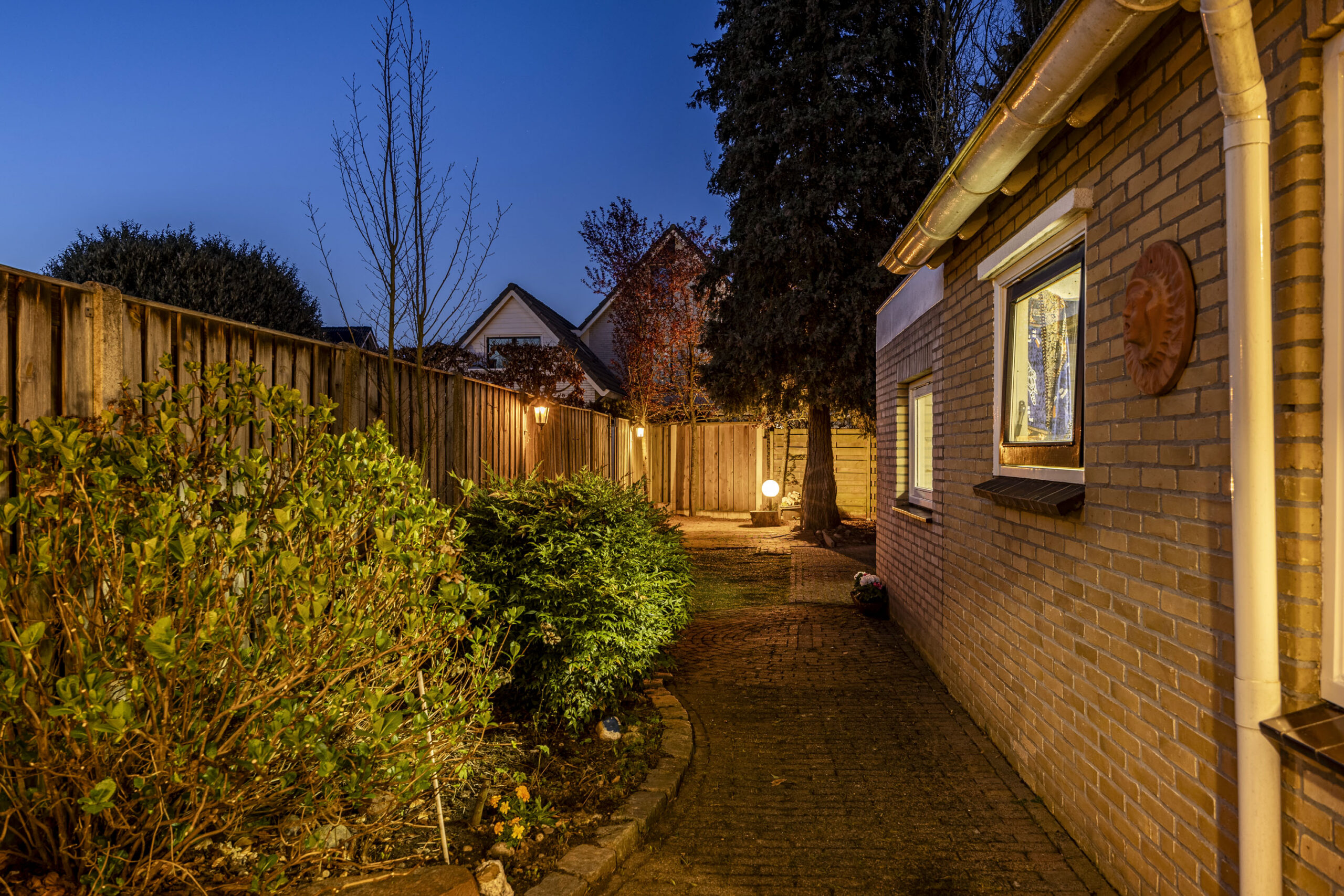 De woning beschikt over een diepe achtertuin met een combinatie van bestrating, groen en beplanting, waardoor er meerdere zitplekken mogelijk zijn. Achterin de tuin bevindt zich een ruime berging met overkapping, ideaal voor opslag of het stallen van fietsen. De voortuin is verzorgd aangelegd en de oprit biedt parkeergelegenheid op eigen terrein.