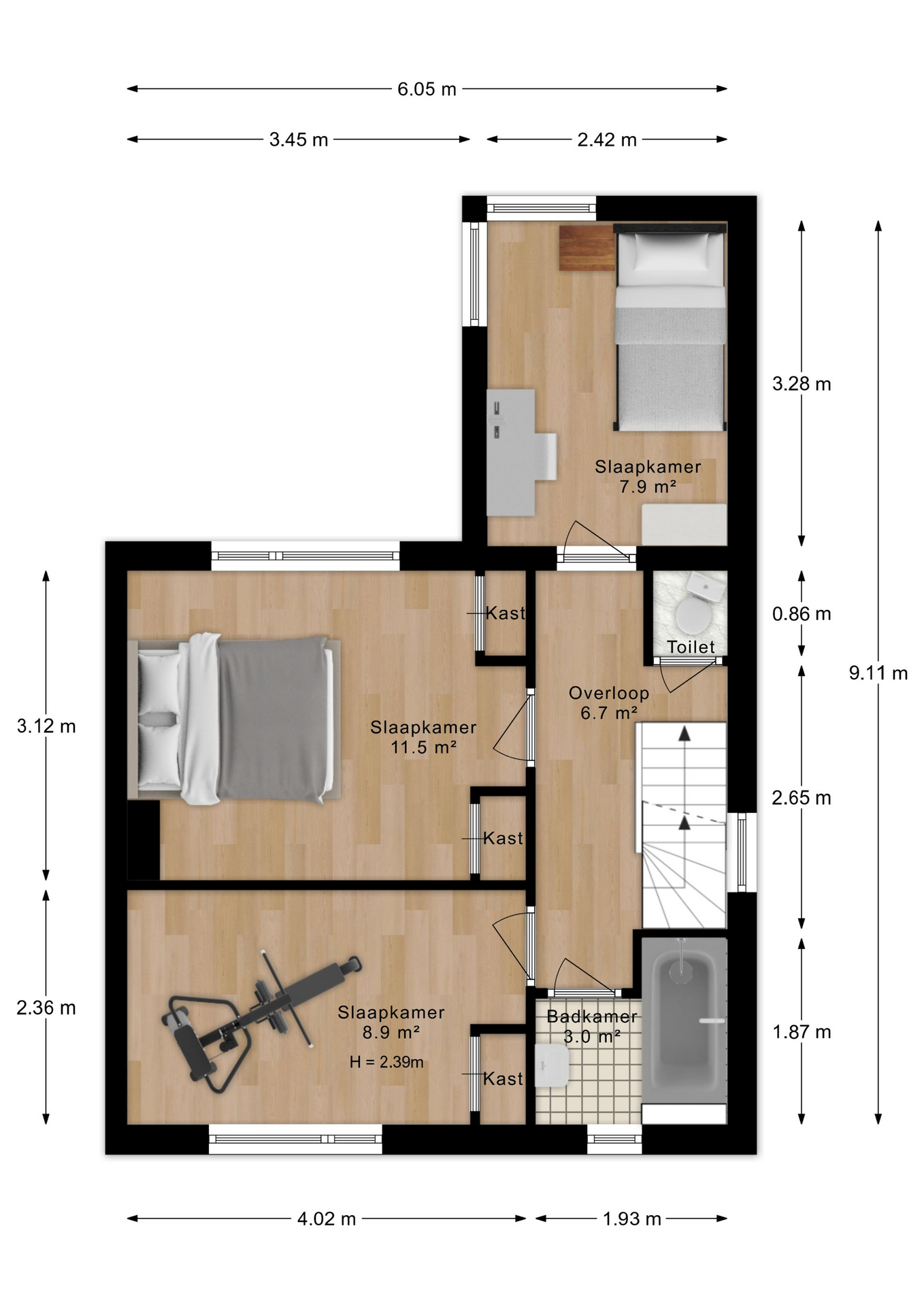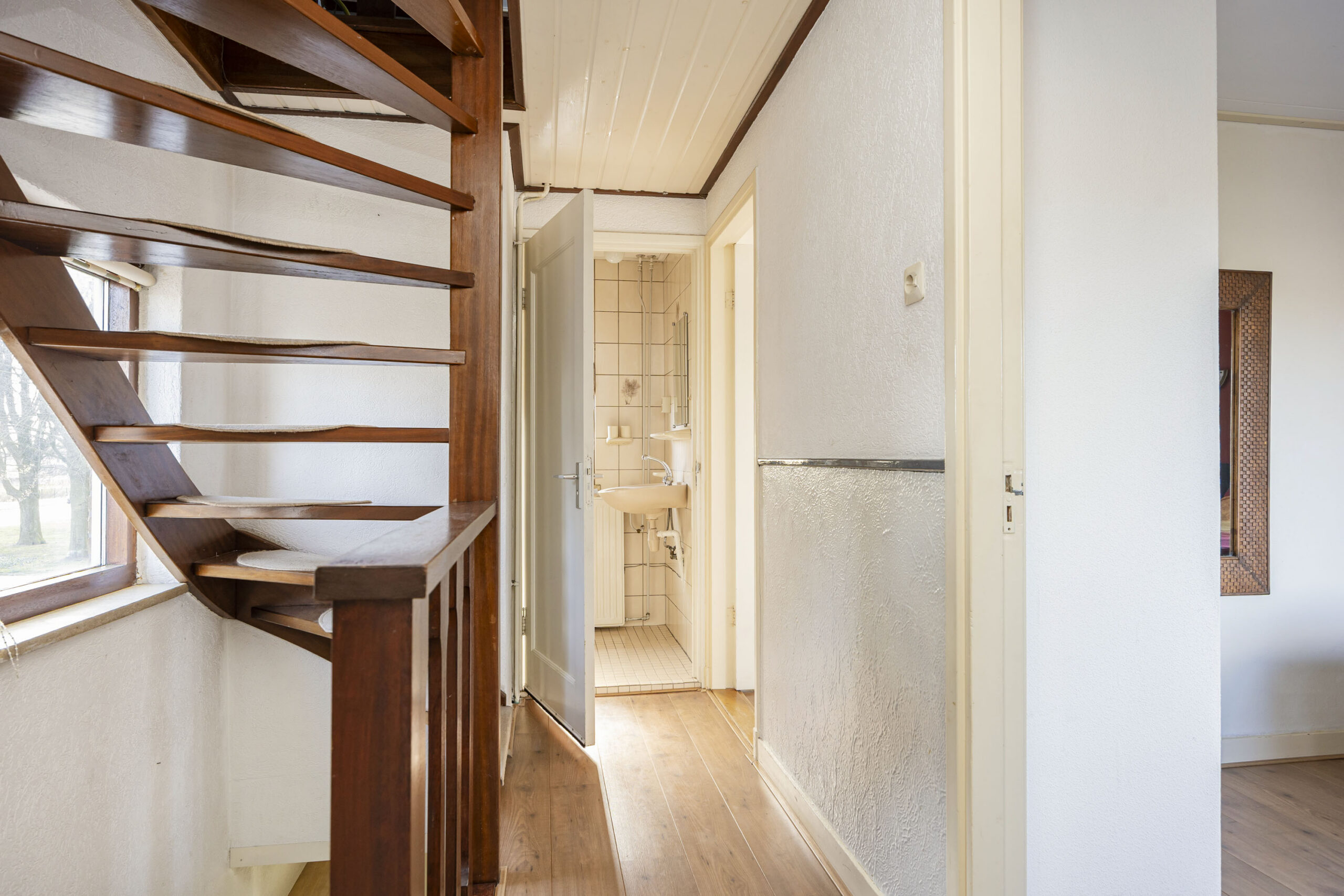 De overloop geeft toegang tot drie slaapkamers van verschillend formaat, waarvan één ruime hoofdslaapkamer en twee goed bruikbare kamers. De badkamer is compact en voorzien van een ligbad en wastafel. Daarnaast is er een separaat toilet aanwezig op de overloop. Diverse vaste kasten zorgen voor extra bergruimte.
