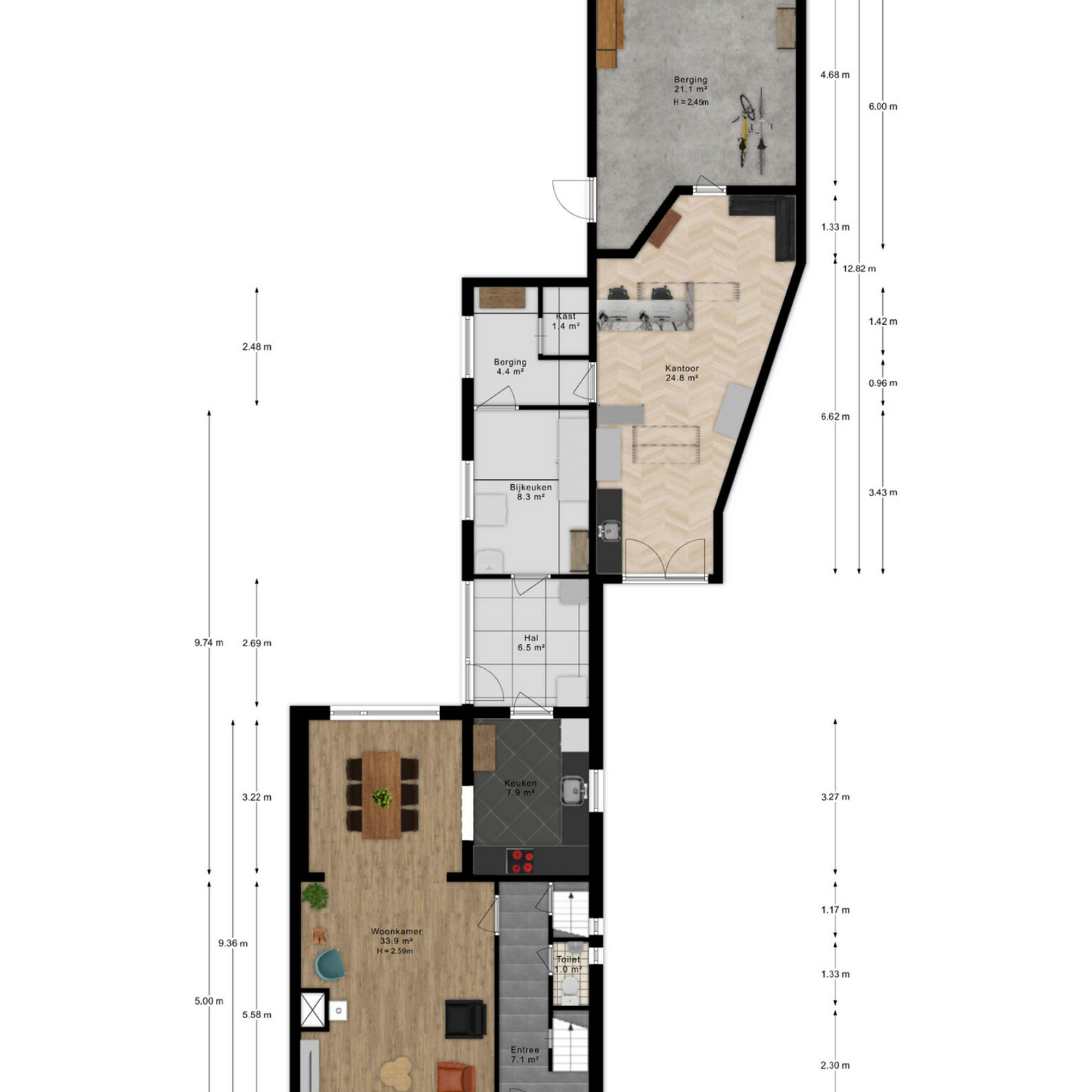 Via de entree betreed je de hal met meterkast, toiletruimte en toegang tot de kelder, ideaal voor provisie en extra opslag. Vanuit hier heb je toegang tot de woonkamer, gesitueerd aan de voorzijde van de woning. De lichte en ruime woonkamer met aan de achterzijde het eetgedeelte biedt een prettige leefruimte met zicht op de tuin. Via het eetgedeelte bereik je de keuken. Vanuit de hal bereik je de praktische bijkeuken, met daarachter extra bergruimte en een kast. Aan de achterzijde bevindt zich een royale, multifunctionele ruimte ingericht als kantoor, zeer geschikt voor werken aan huis. Daarnaast vind je hier een grote berging.