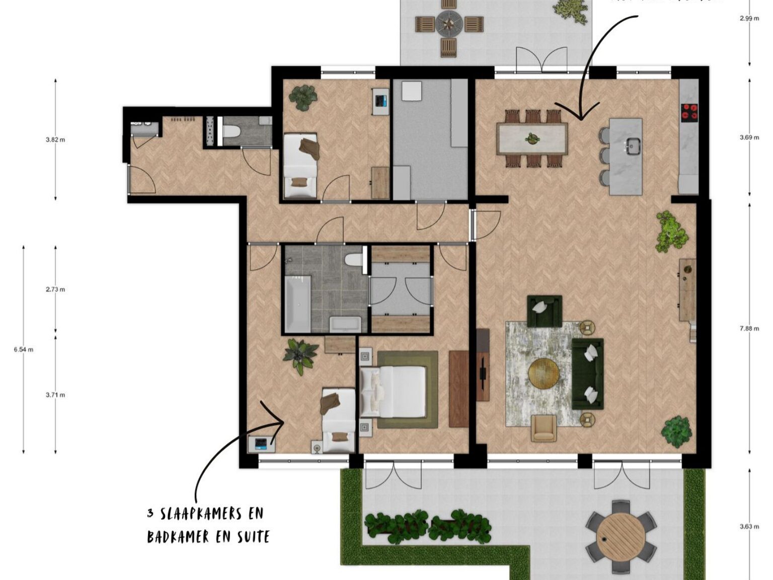 Het meest royale appartement van het complex. Maar liefst ca. 169 m2 woonoppervlakte, een woon- en kookgedeelte van bijna 80 m2, 3 slaapkamers en 38 m2 terras! De indeling begint bij een royale entree/hal met toegang tot 3 slaapkamers, de technische ruimte en een separaat toilet. Aan het eind van de hal kom je de woonkamer binnen: een riante open ruimte met enerzijds de zithoek, anderzijds het kookgedeelte. Aan weerszijden grote raampartijen met openslaande deuren, zodat je toegang krijgt tot de 2 eigen terrassen. Een weelde aan ruimte binnen en buiten, een unieke woonbeleving.