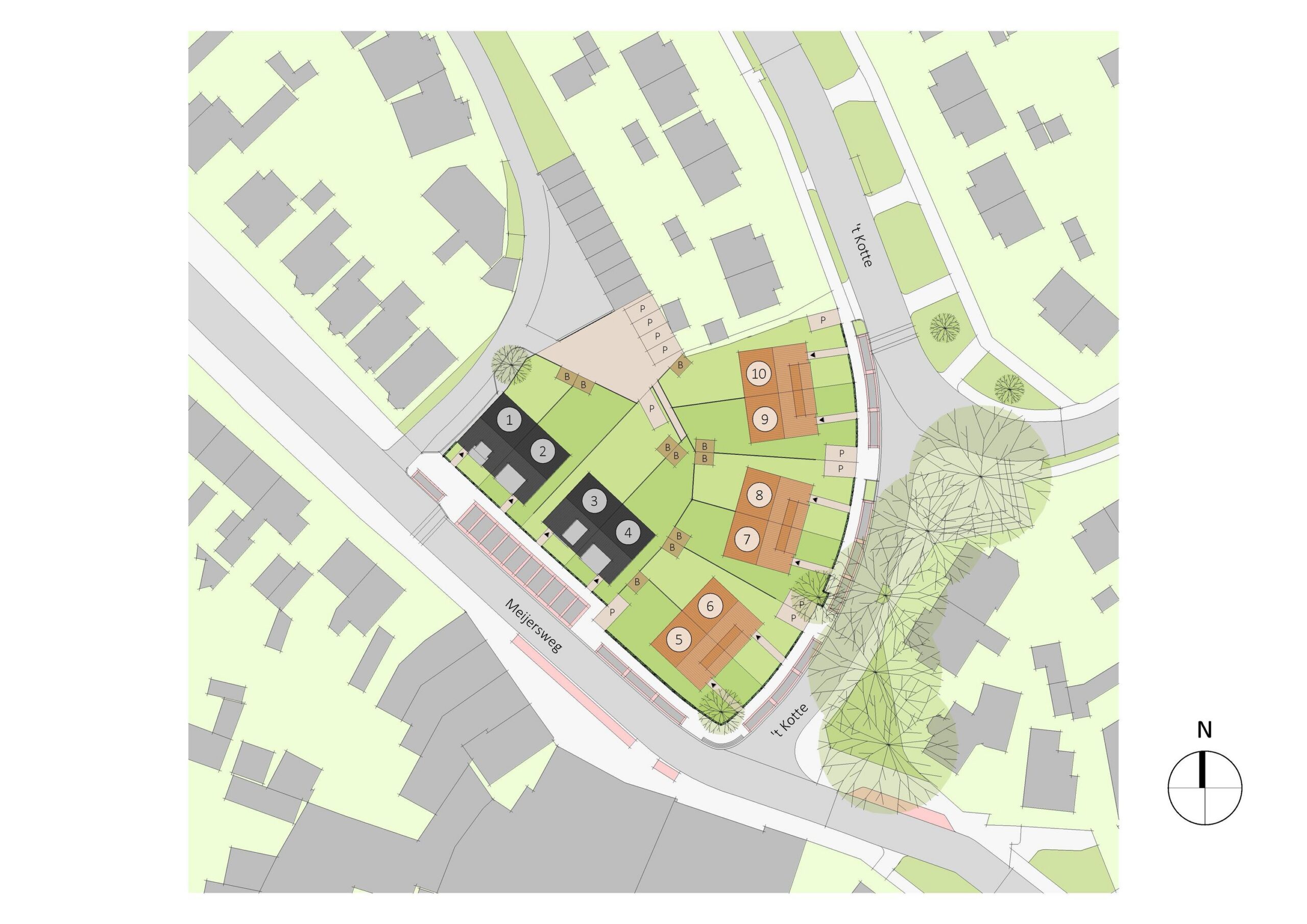Parkeren is mogelijk op eigen parkeerplaats, gelegen aan de achterzijde van de kavels. Hier zal een mandelig terrein worden aangelegd, voorzien van geautomatiseerde toegangspoort, bestemd voor de bewoners van bouwnummers 1 t/m 4. Bij bouwnummer 3 is er zelfs gelegenheid een tweede eigen parkeerplaats te realiseren achterin de tuin!